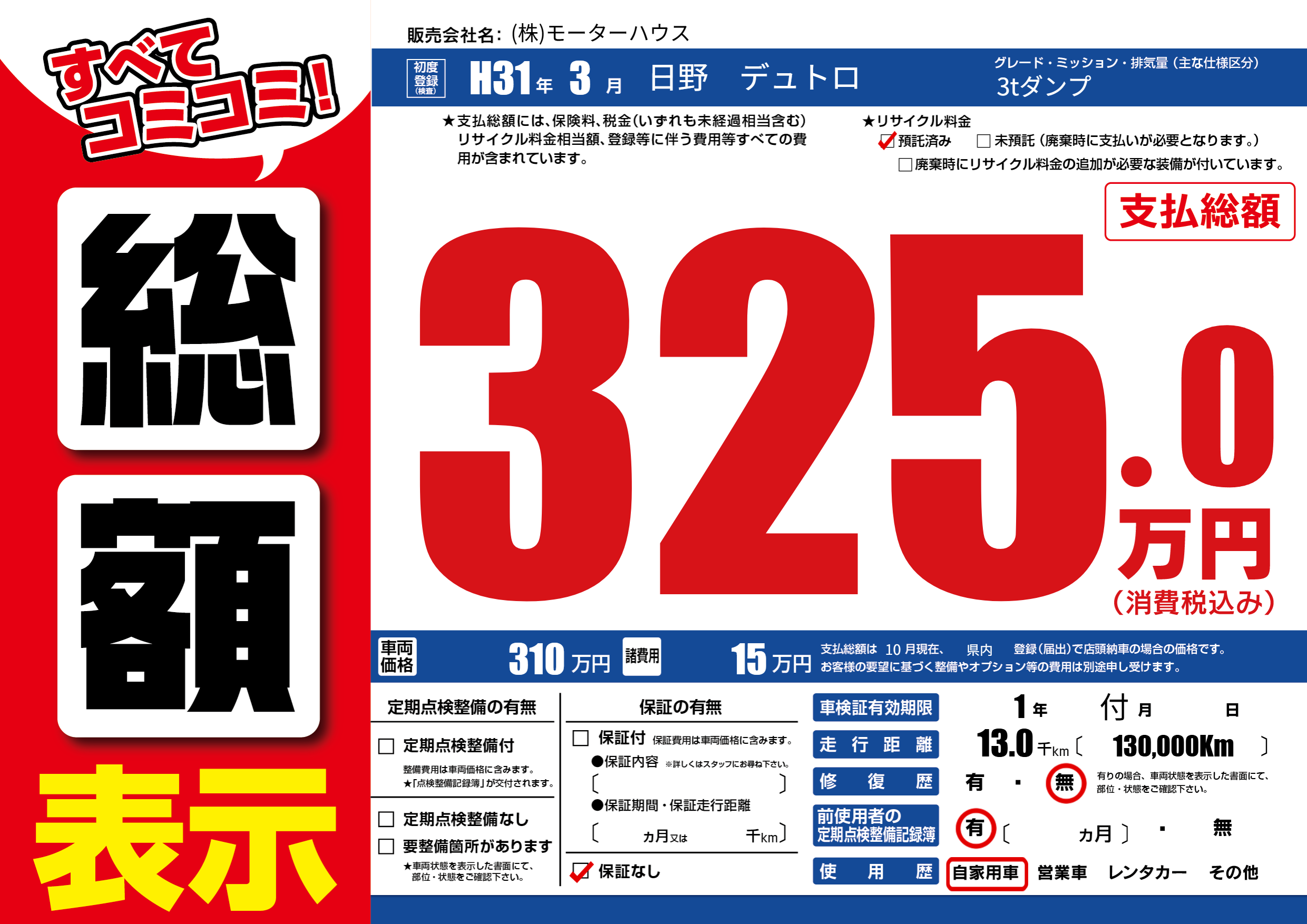 | 車名 | 日野 デュトロ | グレード ミッション 排気量 |