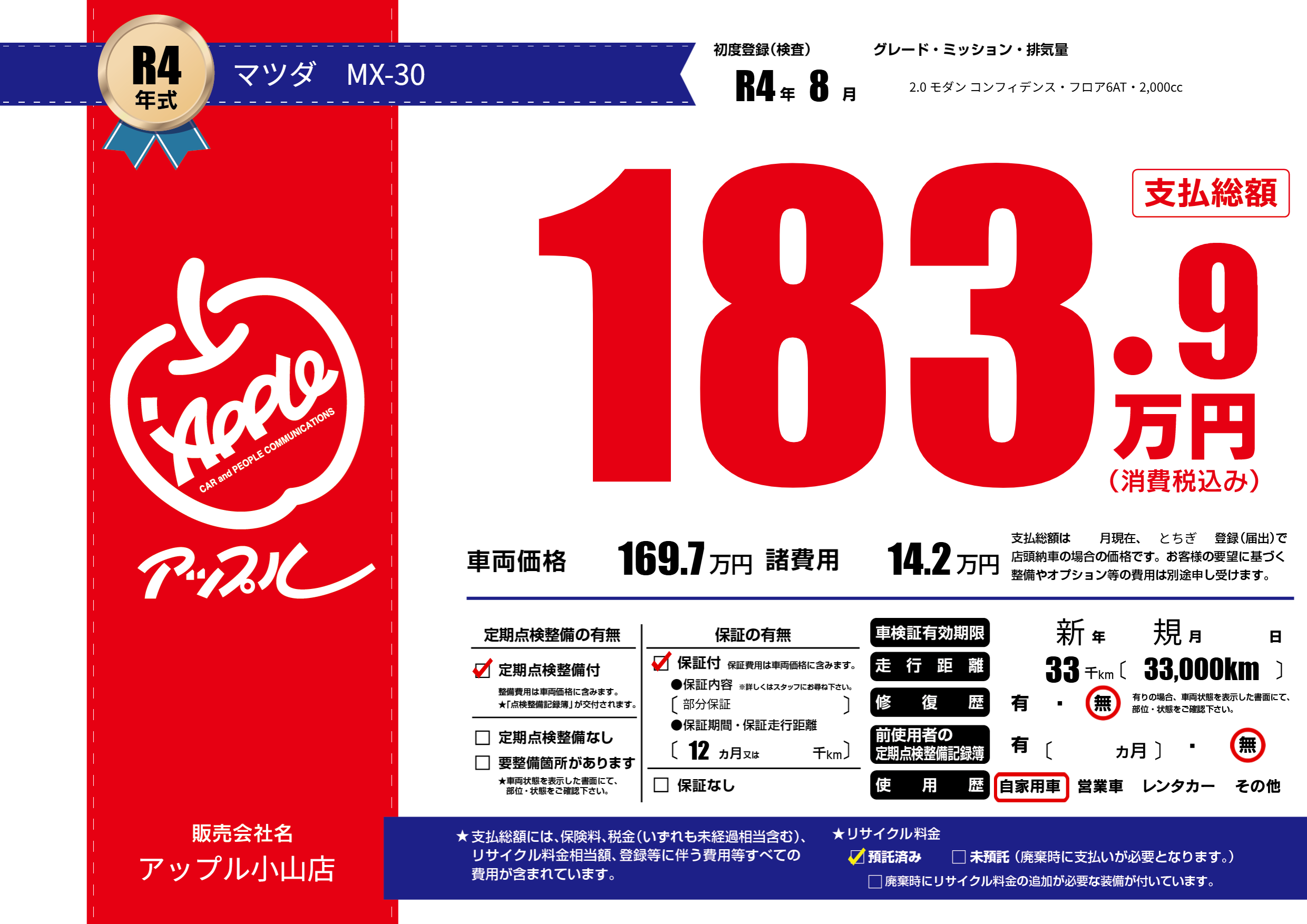 | 車名 | マツダ MX-30 | グレード ミッション 排気量 |