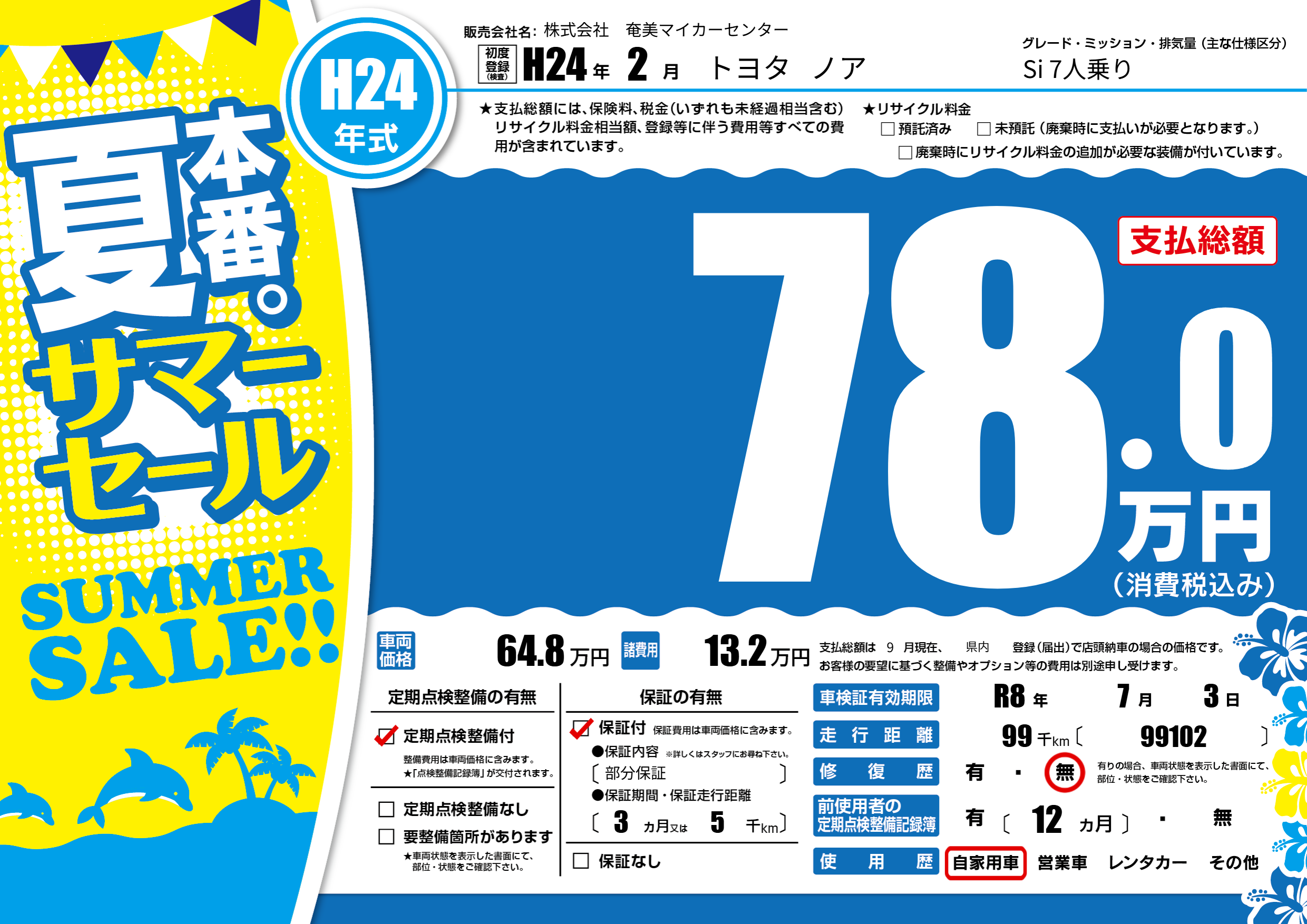 | 走行キロ | 9.9万km | 初年度登録 | H24年2月 |
