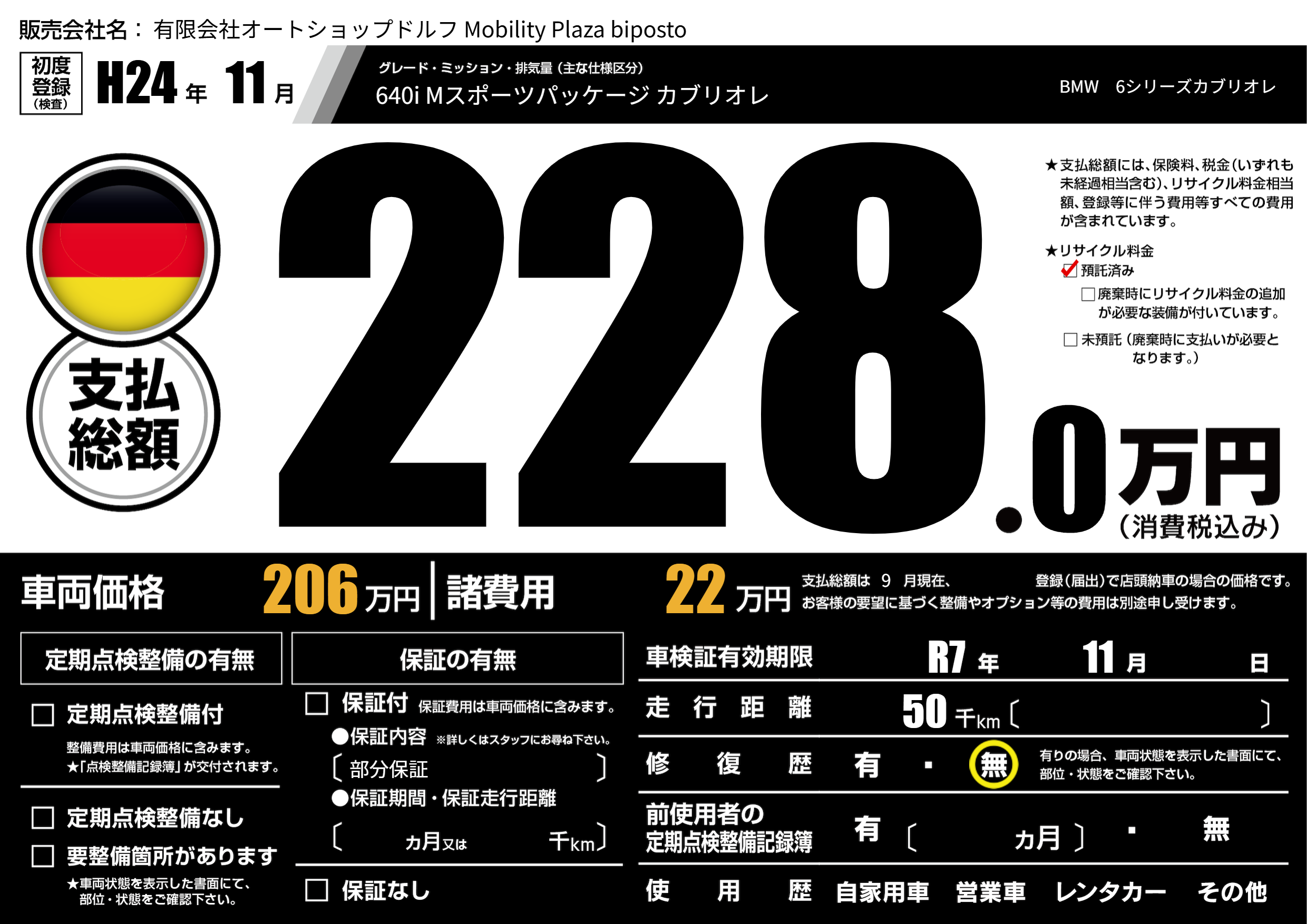 | 車名 | BMW 6シリーズカブリオレ | グレード ミッション 排気量 |