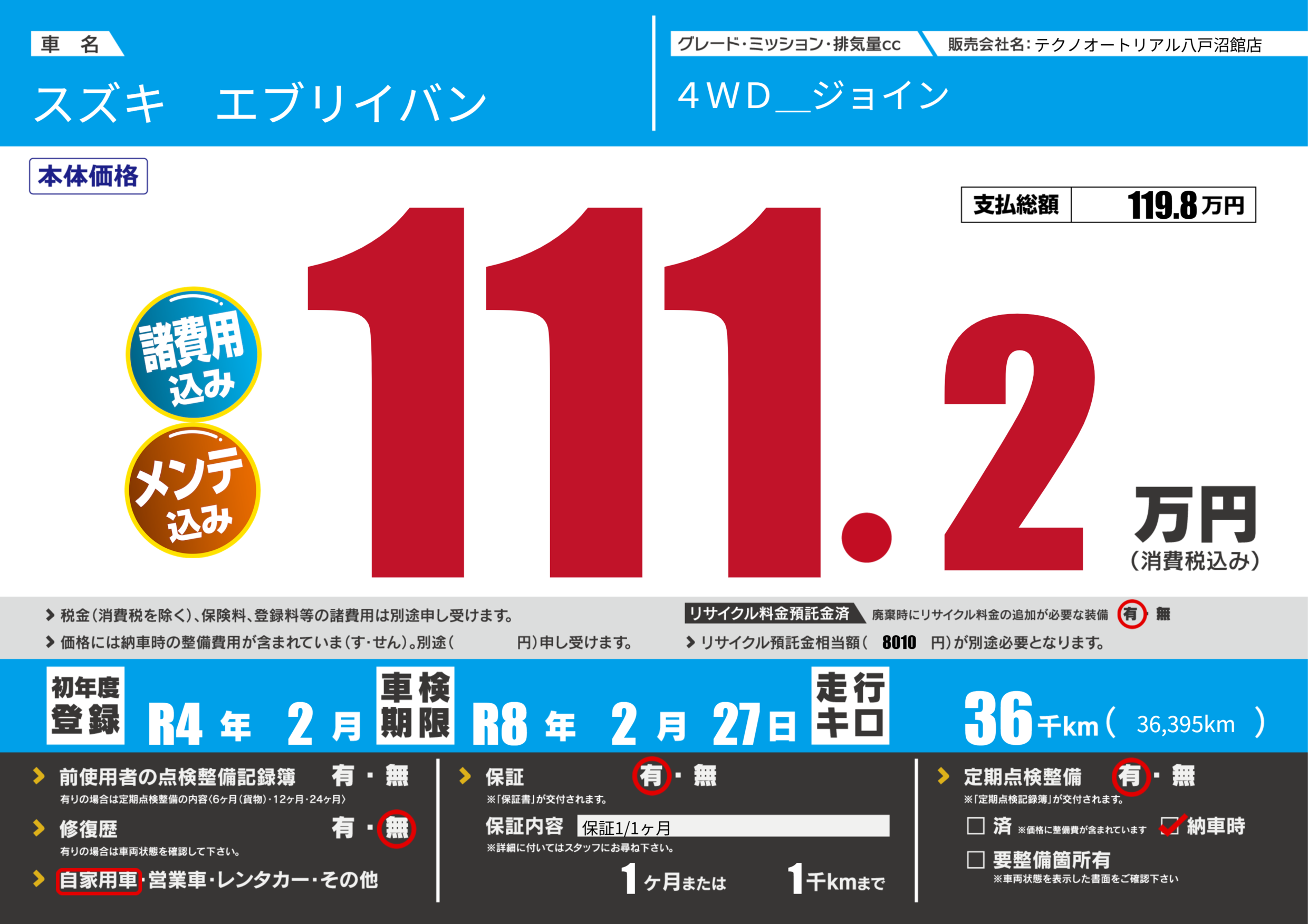 | 車名 | スズキ エブリイバン | グレード ミッション 排気量 |