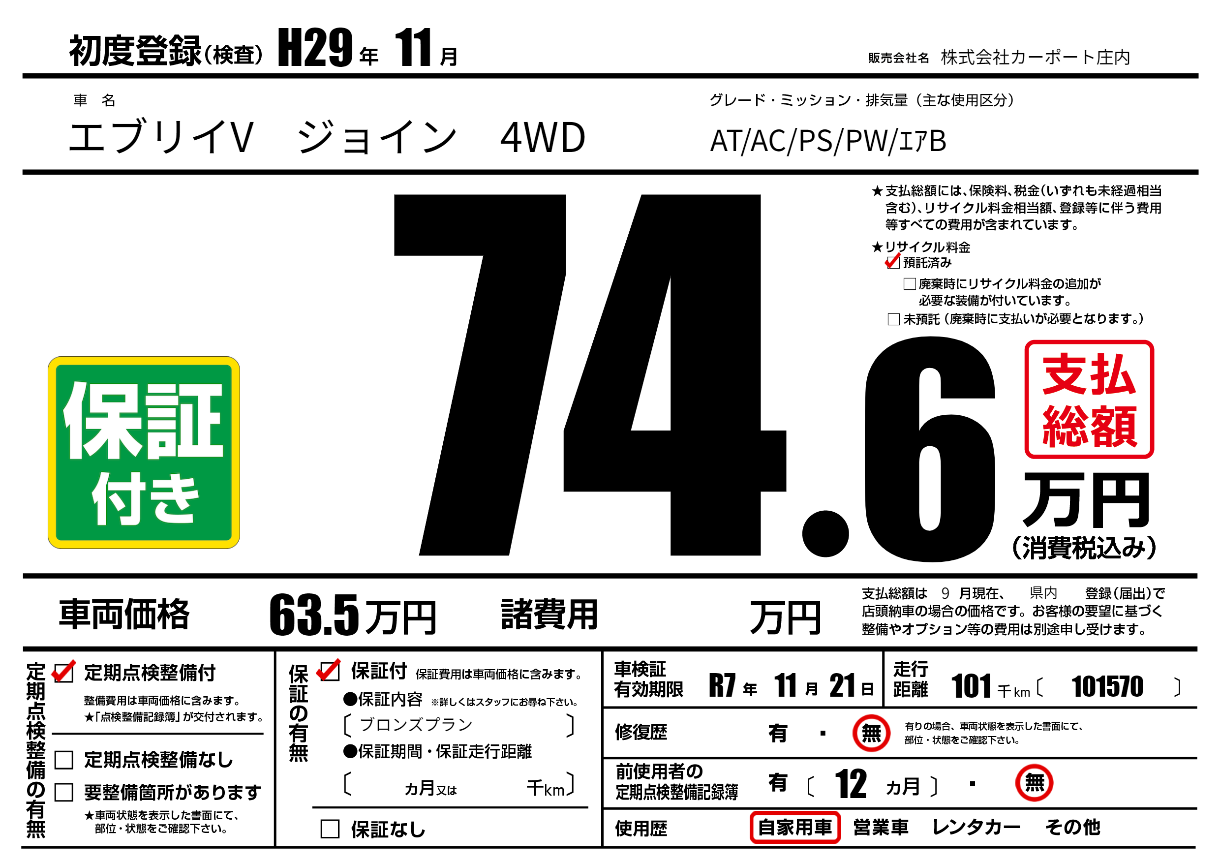 | 車名 | エブリイV ジョイン 4WD | グレード ミッション 排気量 |