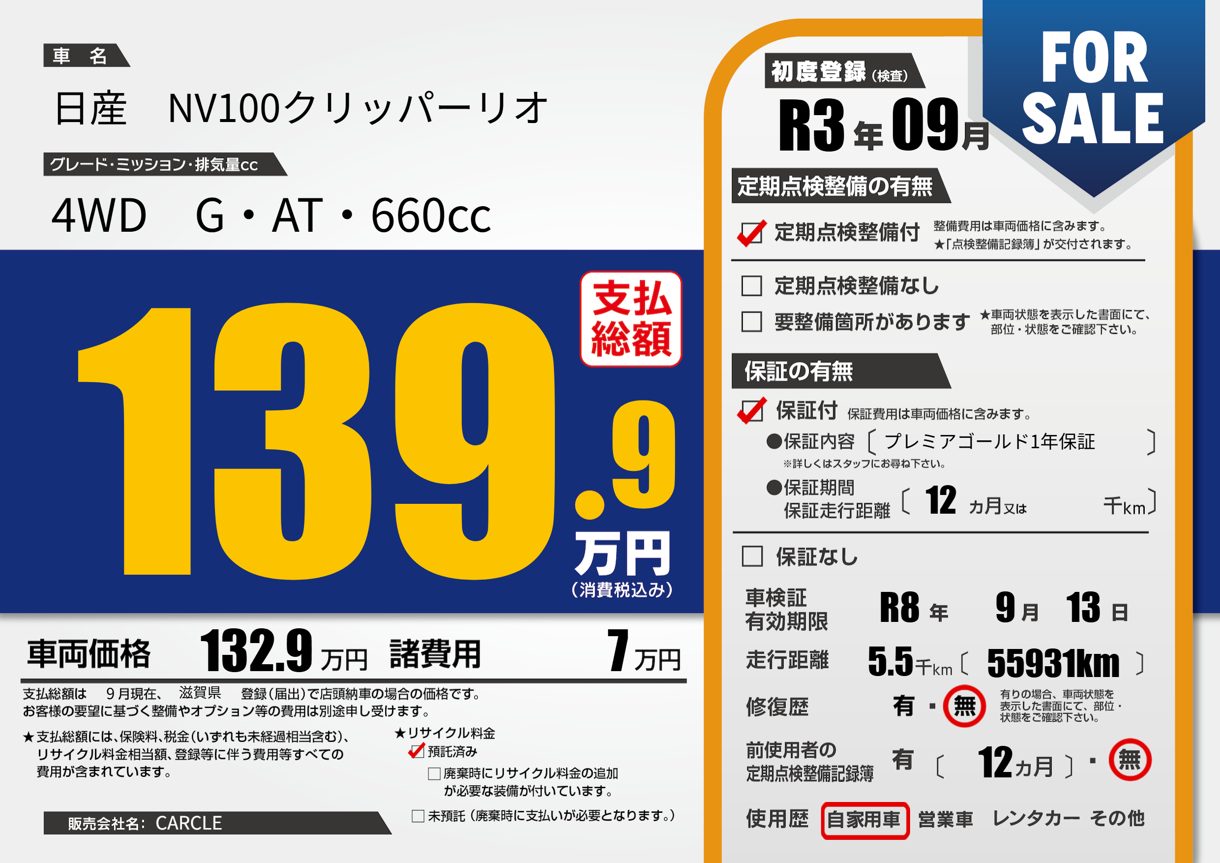 | 車名 | 日産 NV100クリッパーリオ | グレード ミッション 排気量 |