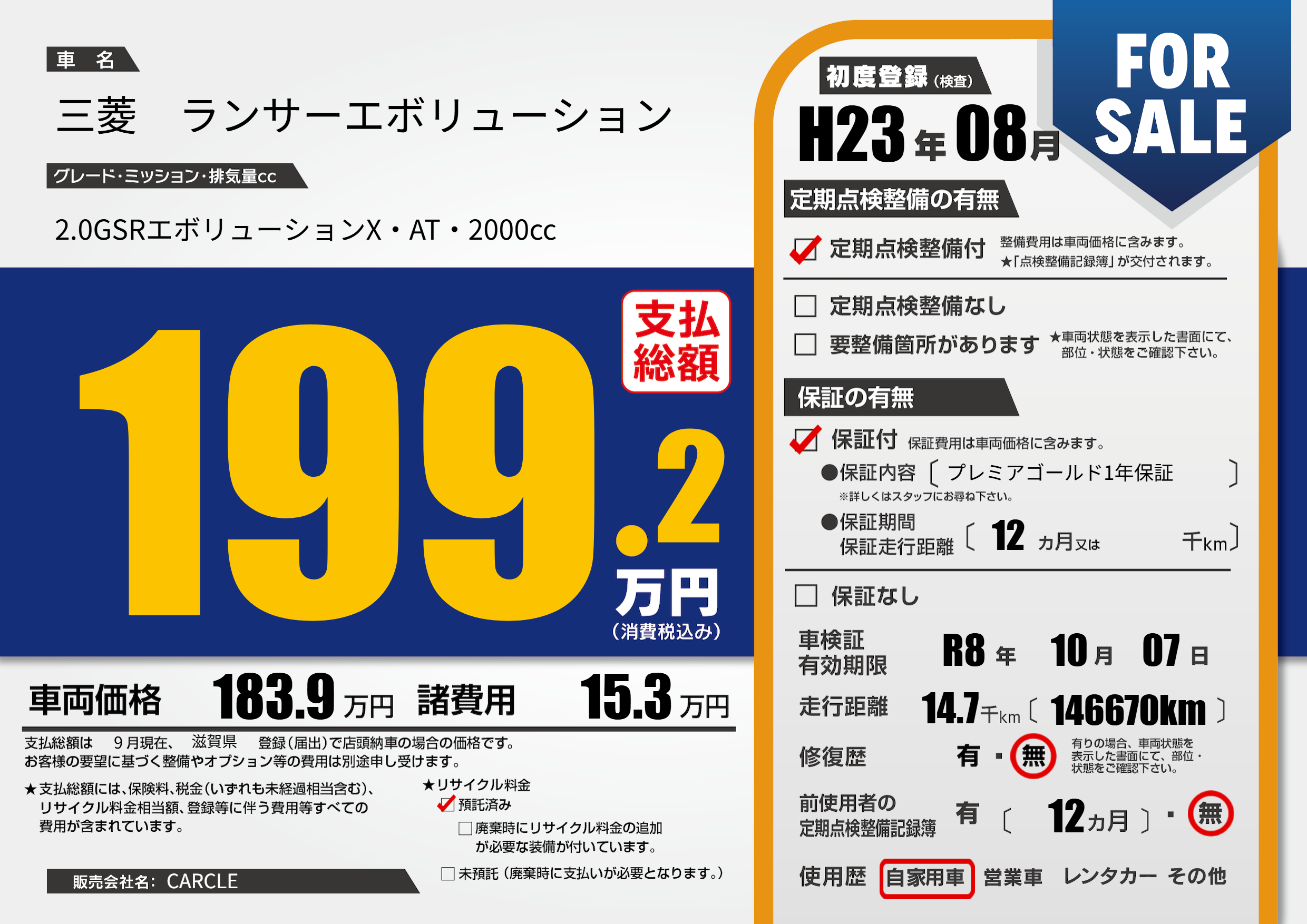 | 車名 | 三菱 ランサーエボリューション | グレード ミッション 排気量 |