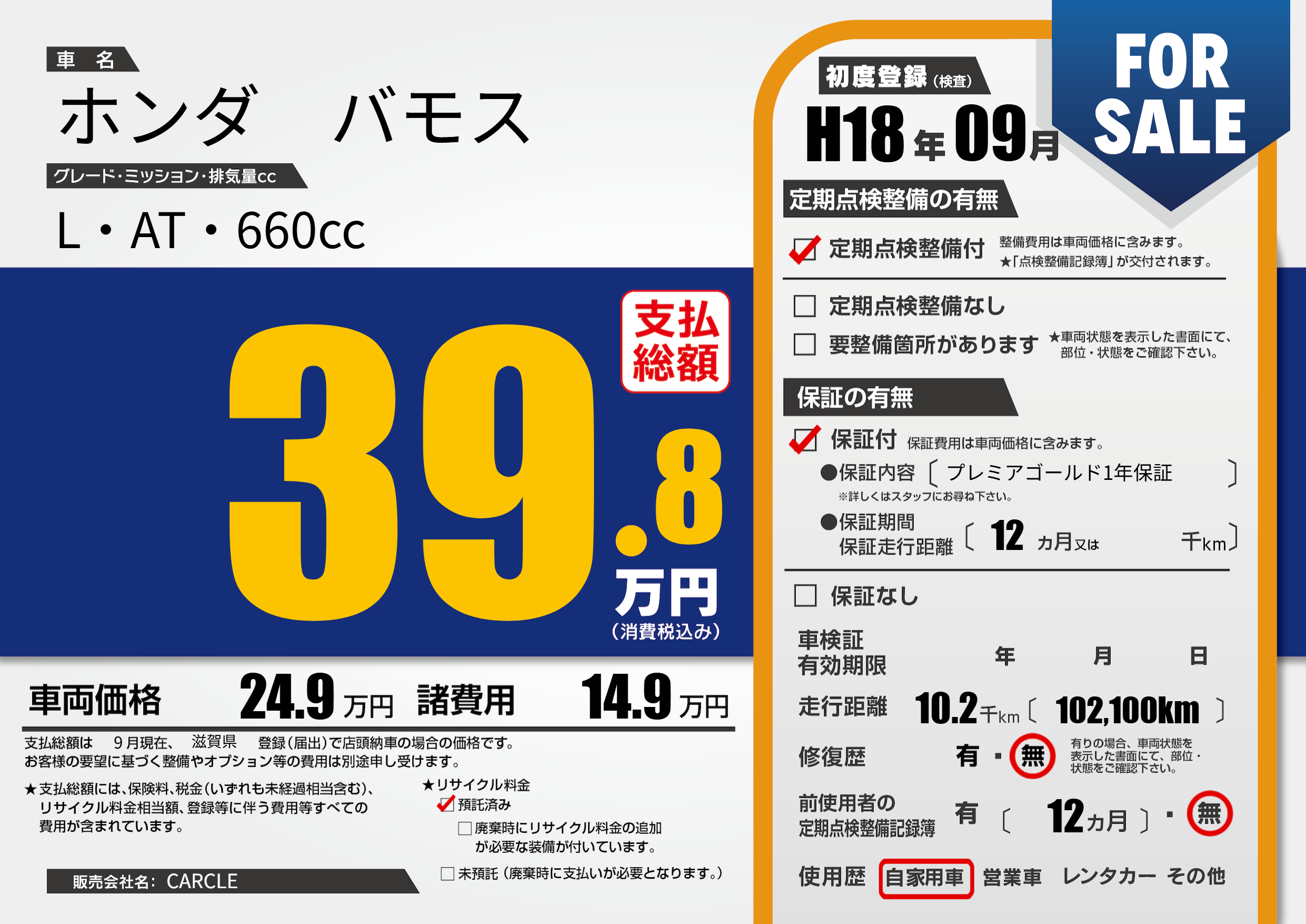 | 車名 | ホンダ バモス | グレード ミッション 排気量 |