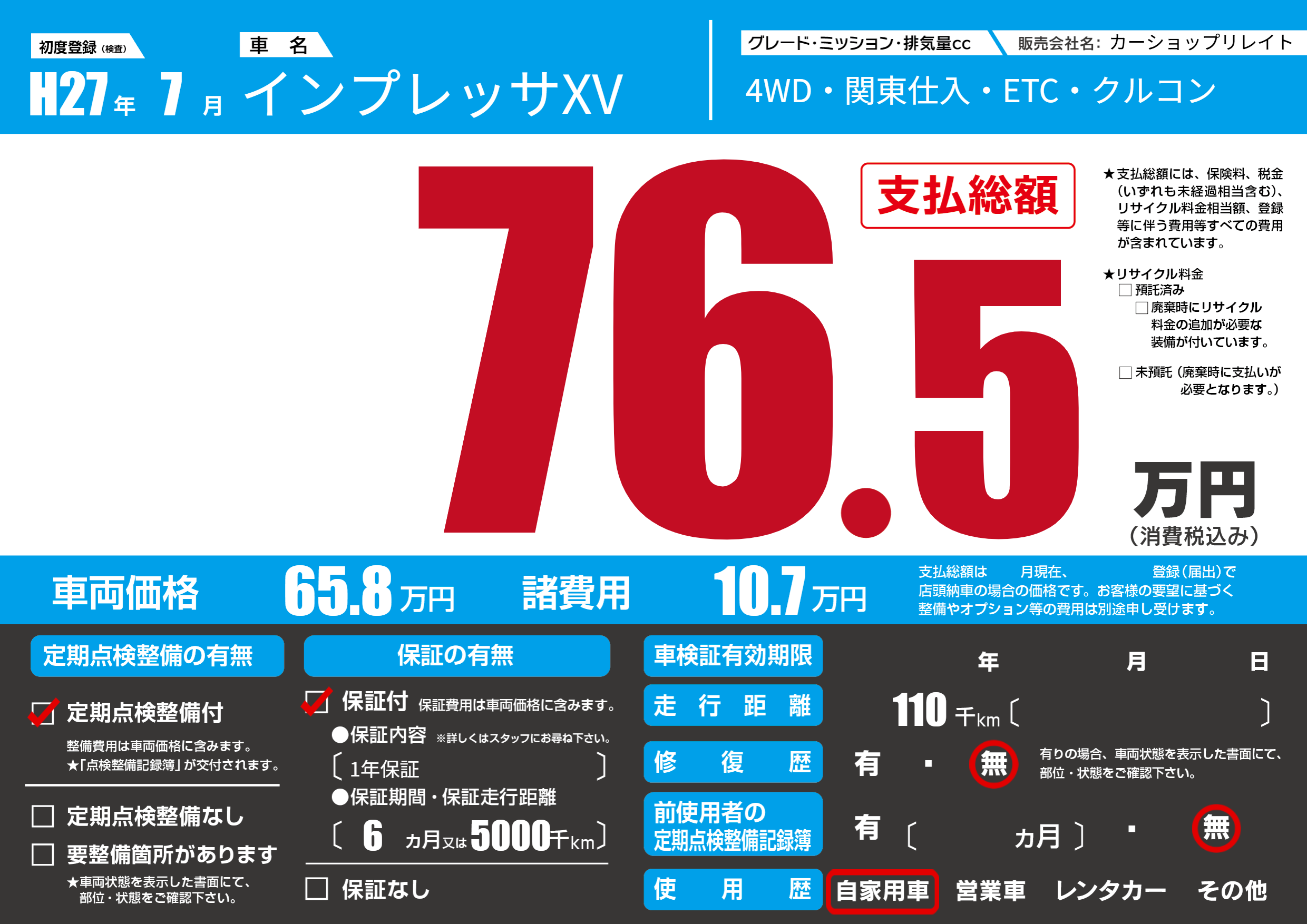 | 車名 | インプレッサXV | グレード ミッション 排気量 |