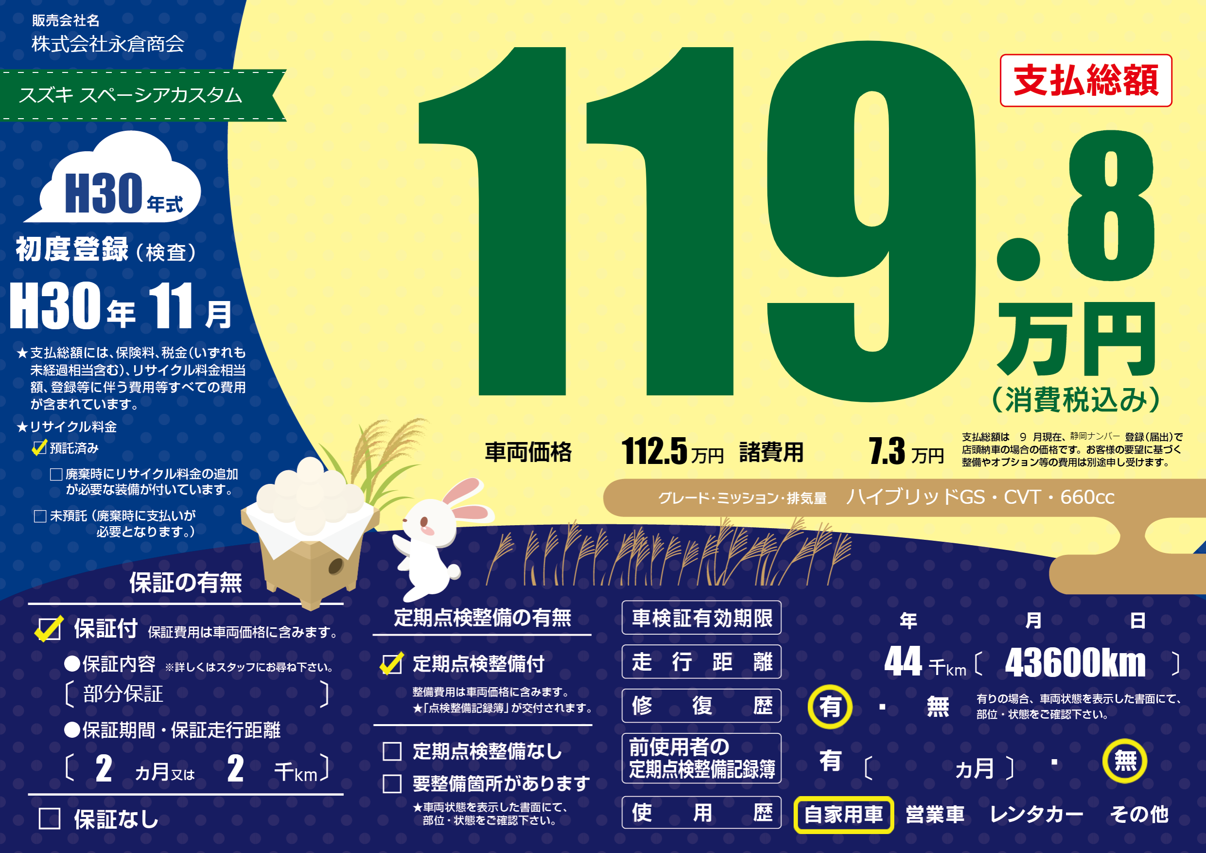 | 走行キロ | 4.4万km | 初年度登録 | H30年11月 |