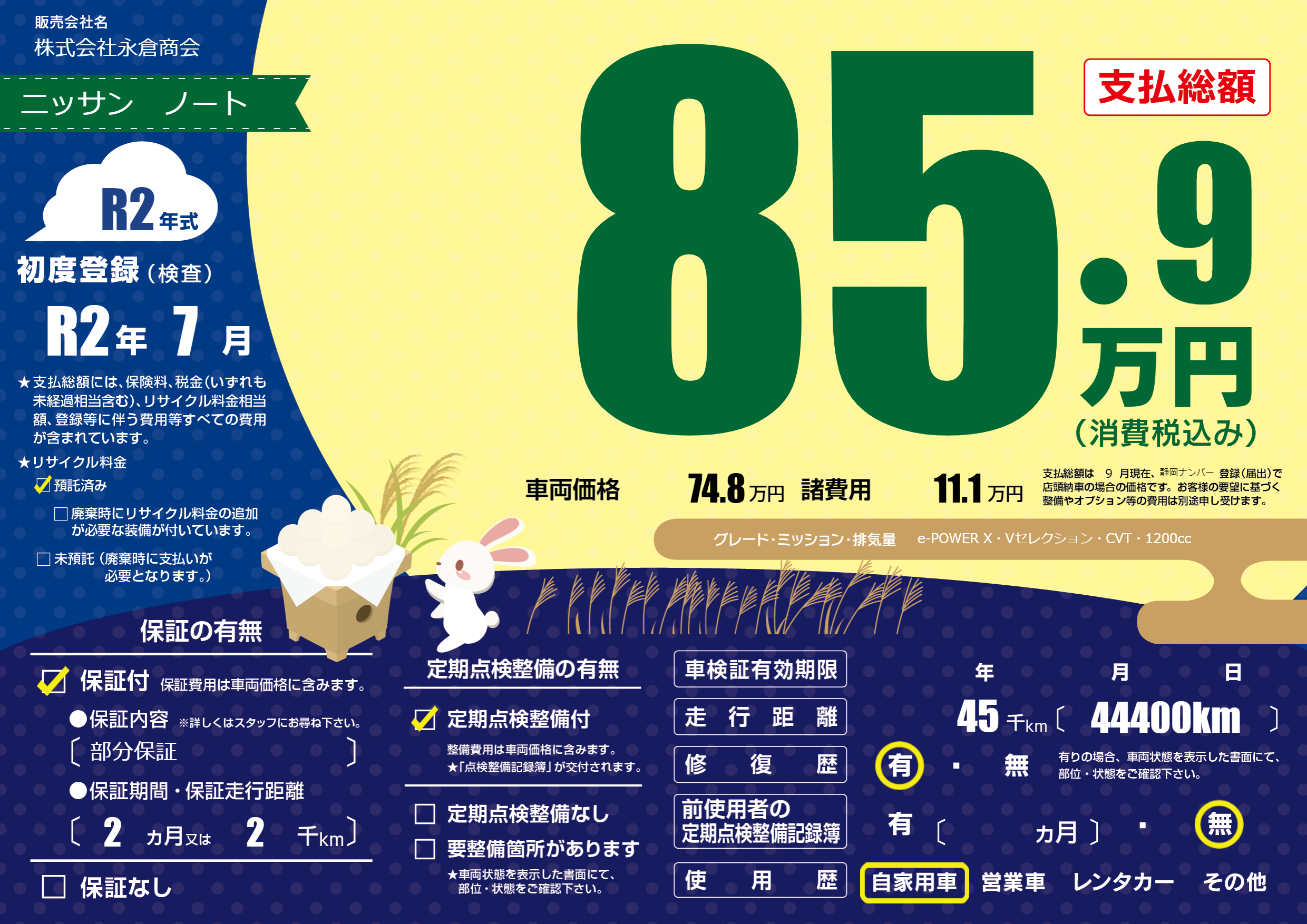 | 車名 | ニッサン ノート | グレード ミッション 排気量 |