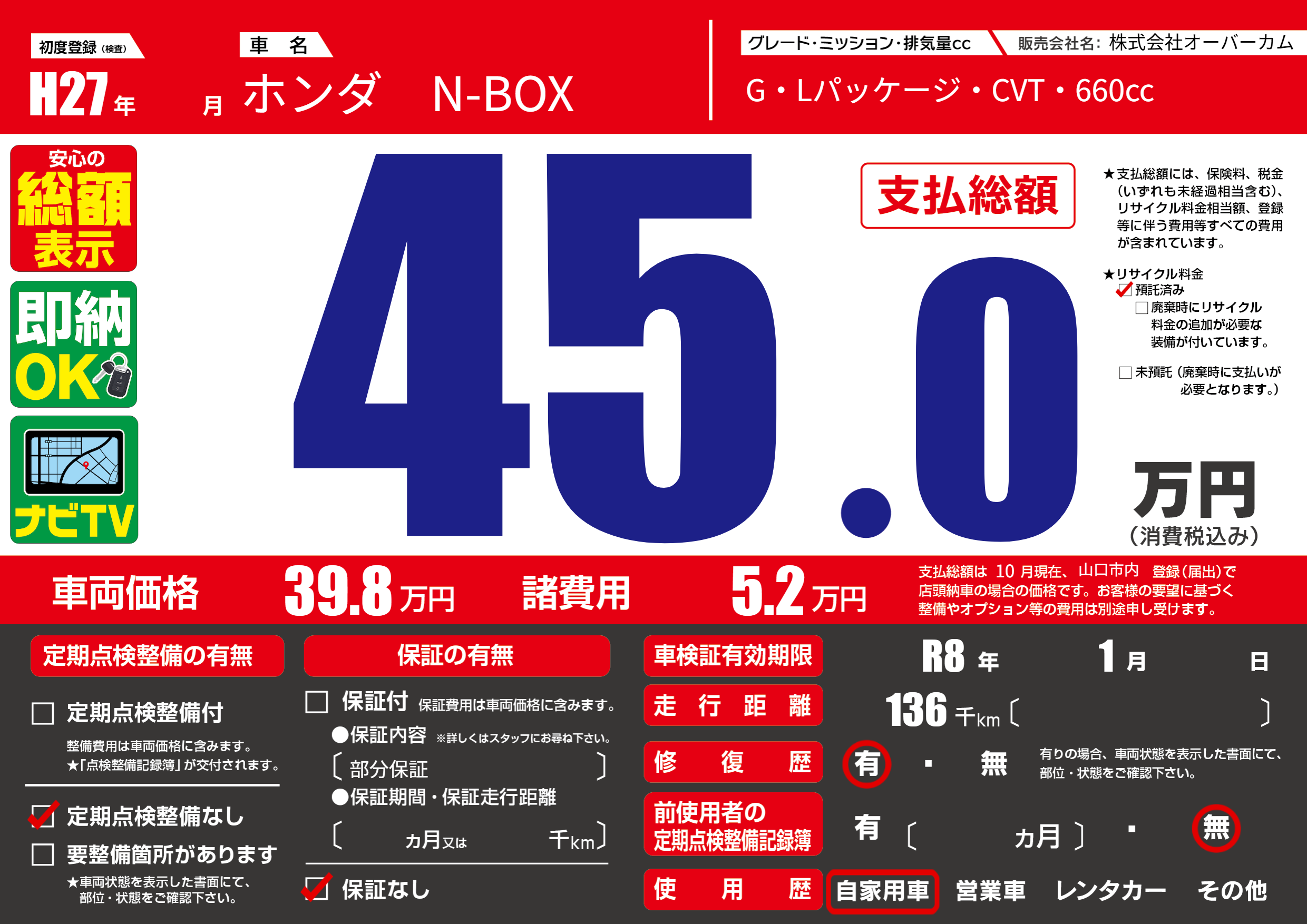 | 車名 | ホンダ N-BOX | グレード ミッション 排気量 |