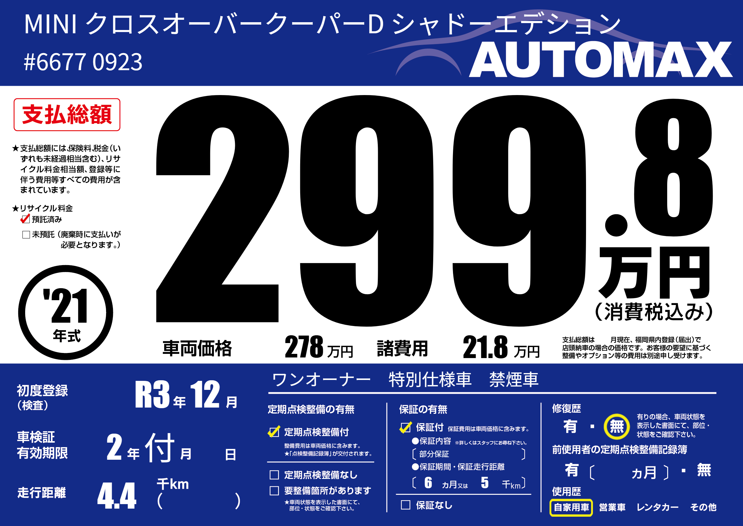 | 車名 | MINI クロスオーバークーパーD シャドーエデション | グレード ミッション 排気量 |