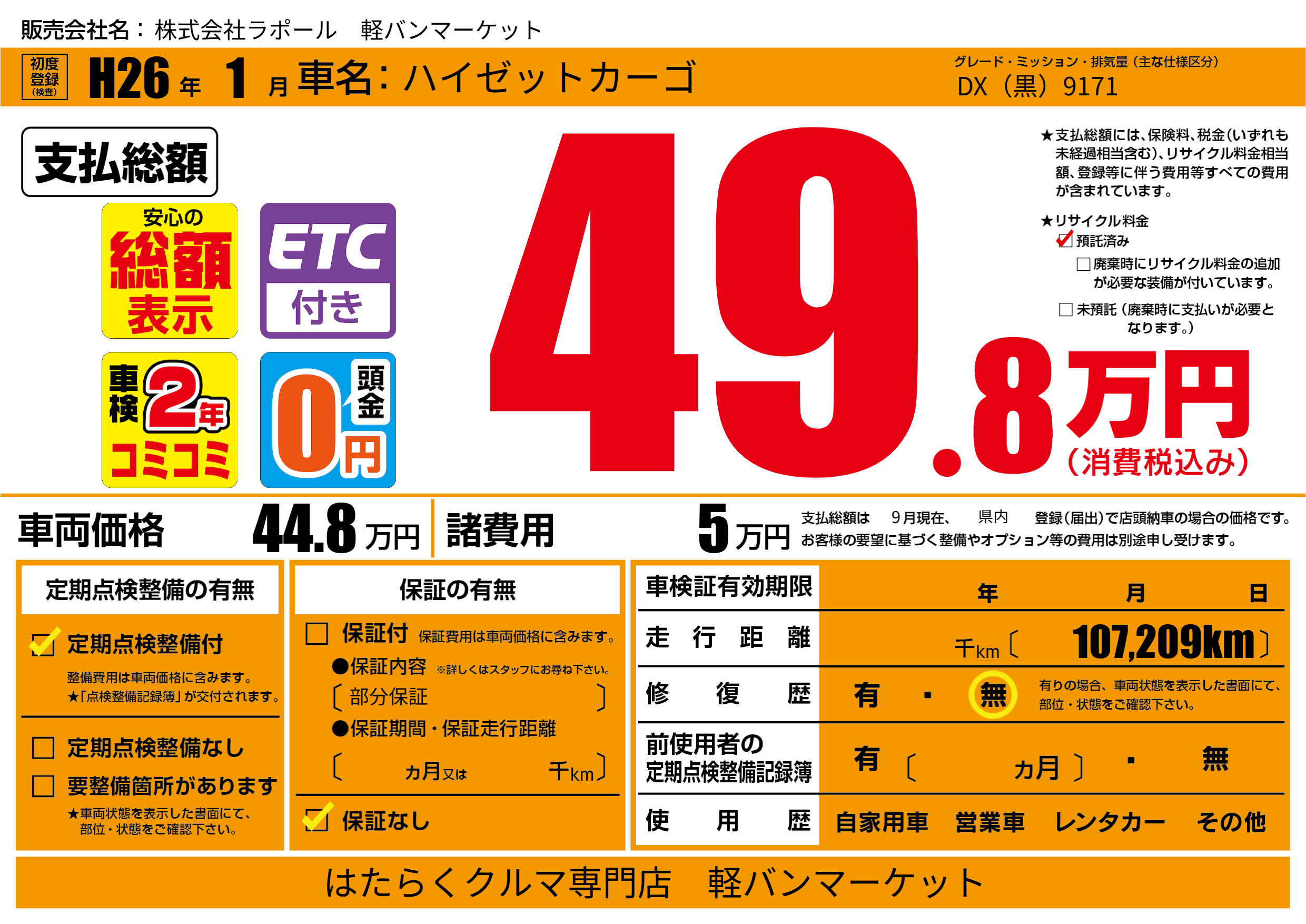 | 車名 | ハイゼットカーゴ | グレード ミッション 排気量 |
