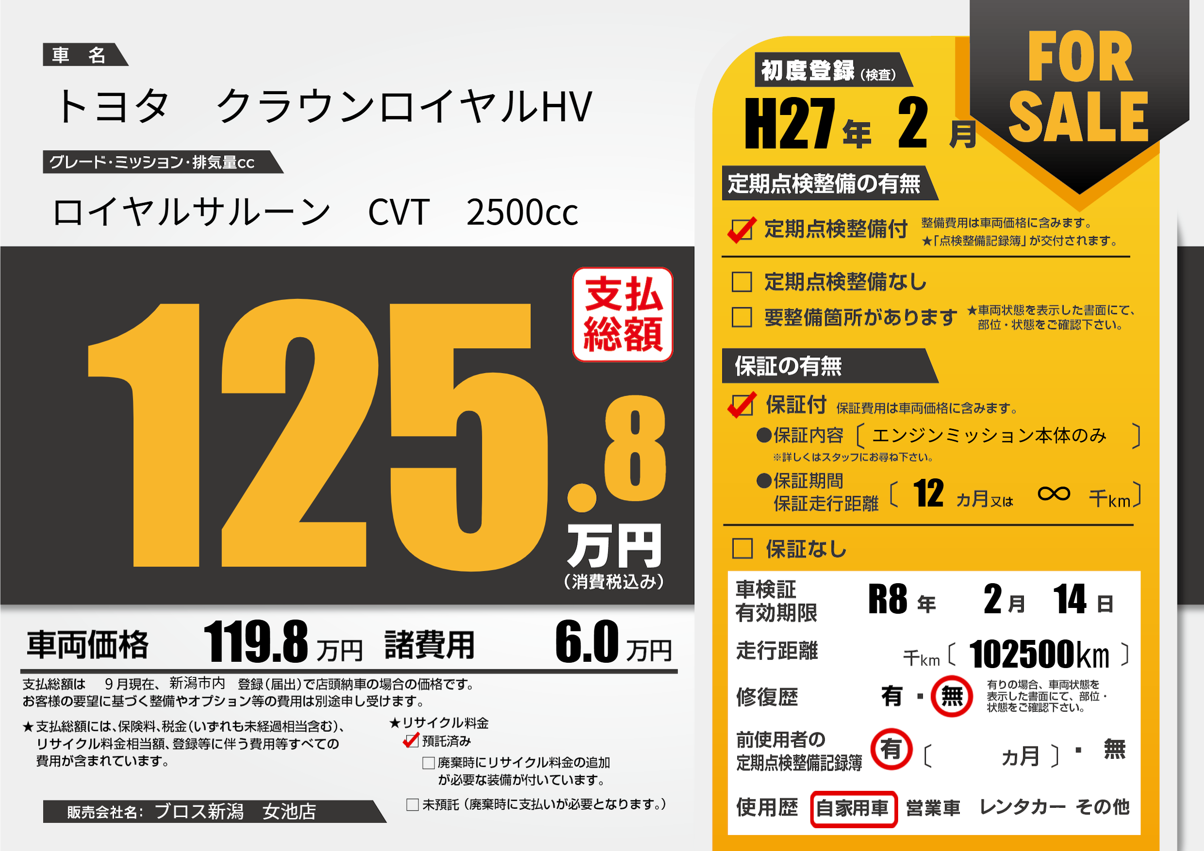 | 車名 | トヨタ クラウンロイヤルHV | グレード ミッション 排気量 |