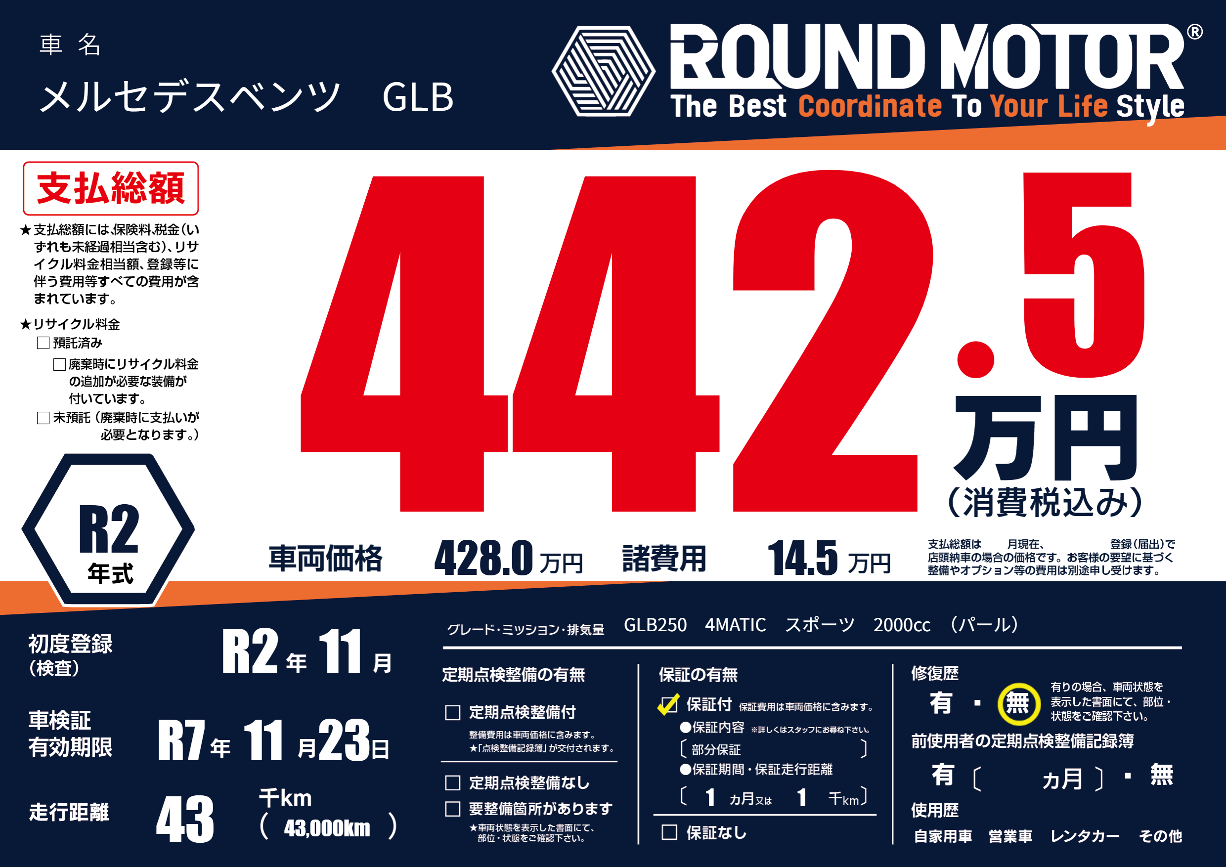 | 車名 | メルセデスベンツ GLB | グレード ミッション 排気量 |