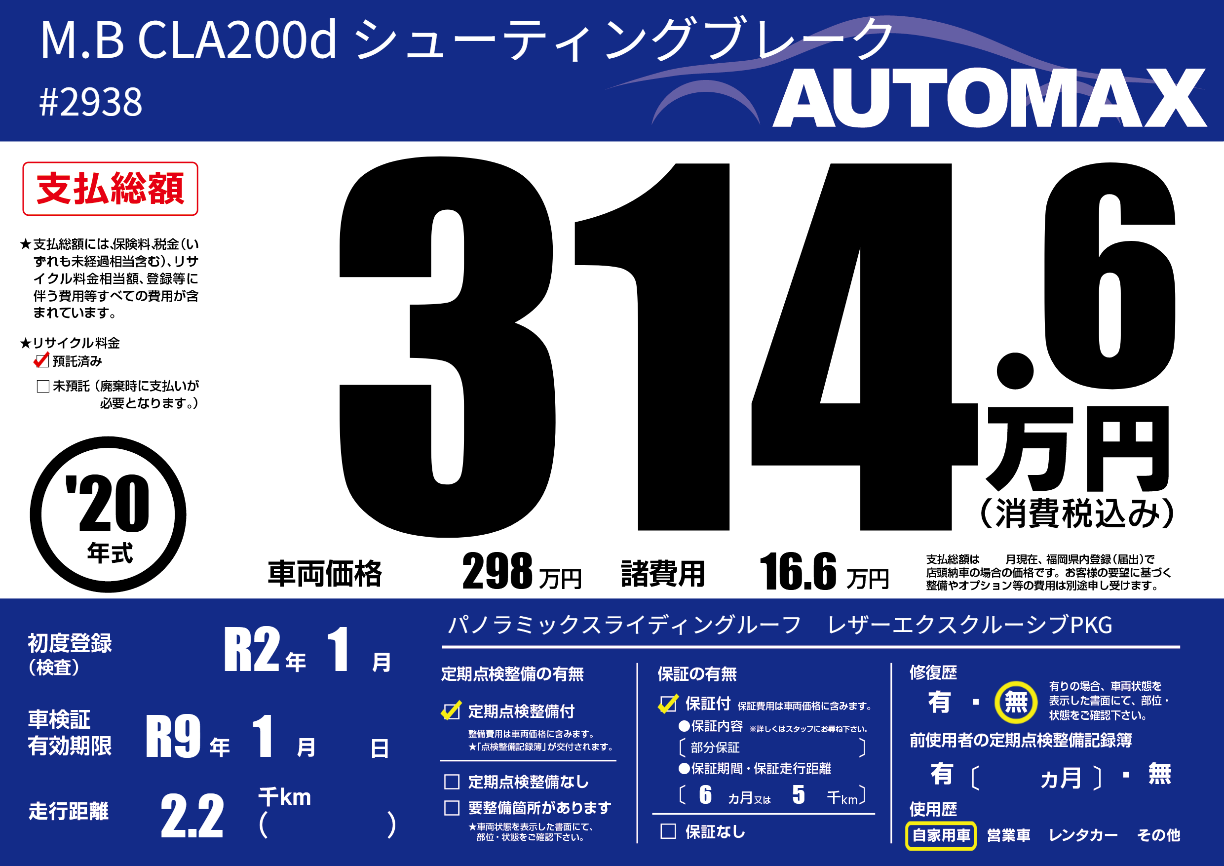 | 車名 | M.B CLA200d シューティングブレーク | グレード ミッション 排気量 |