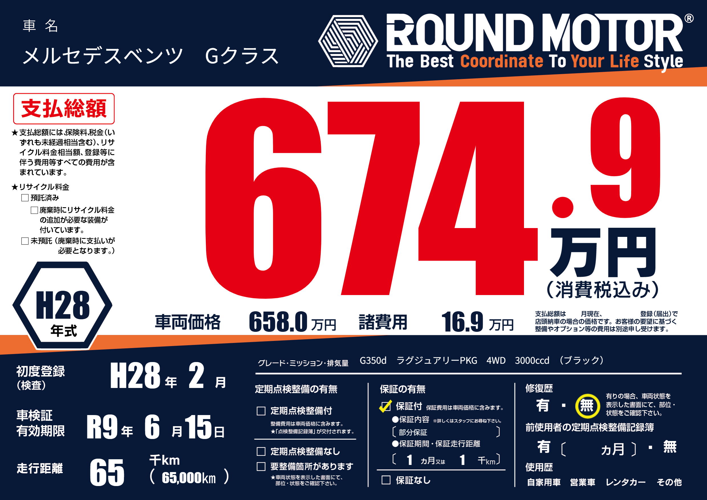| 車名 | メルセデスベンツ Gクラス | グレード ミッション 排気量 |
