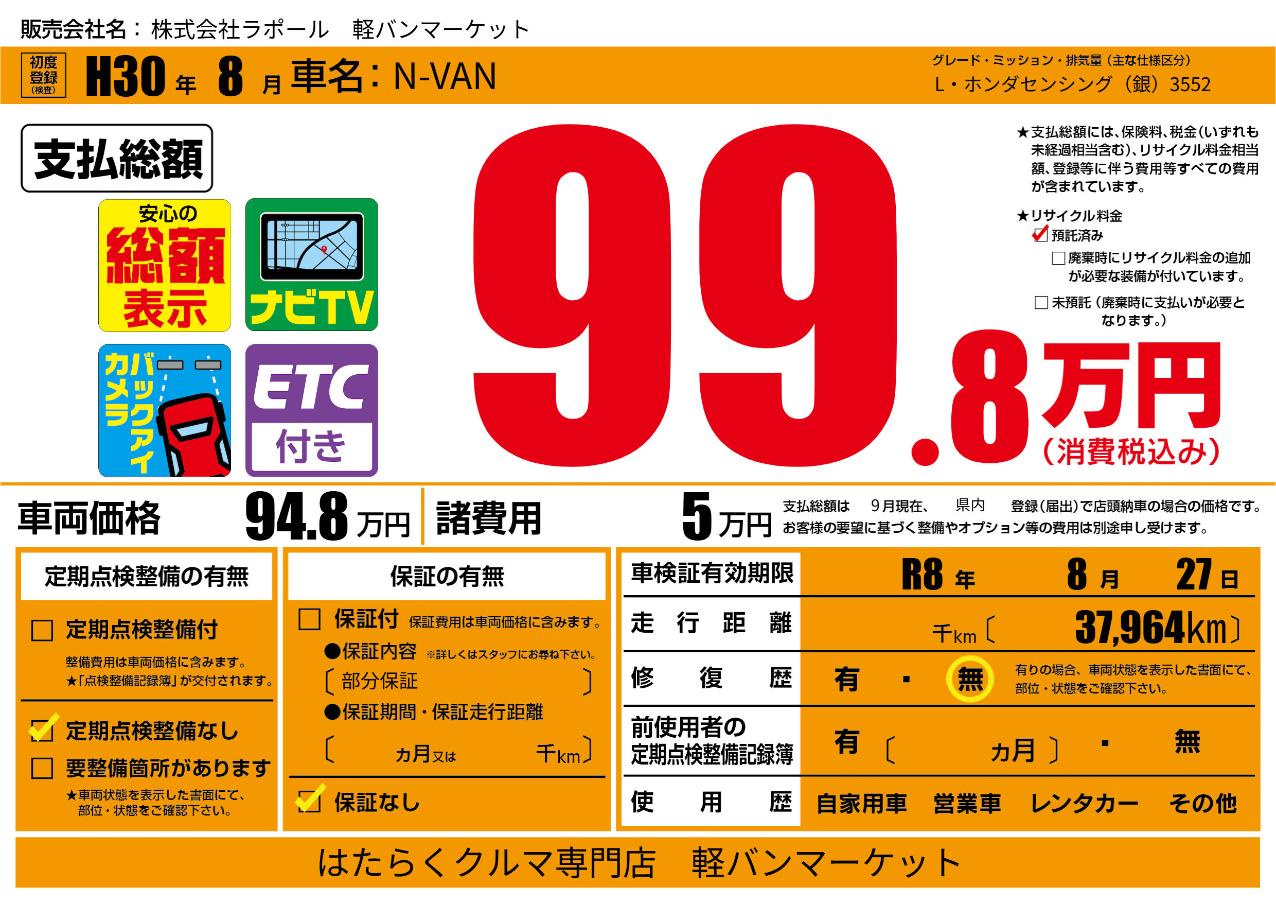 なし | 車検制限 | R8年8月27月 |