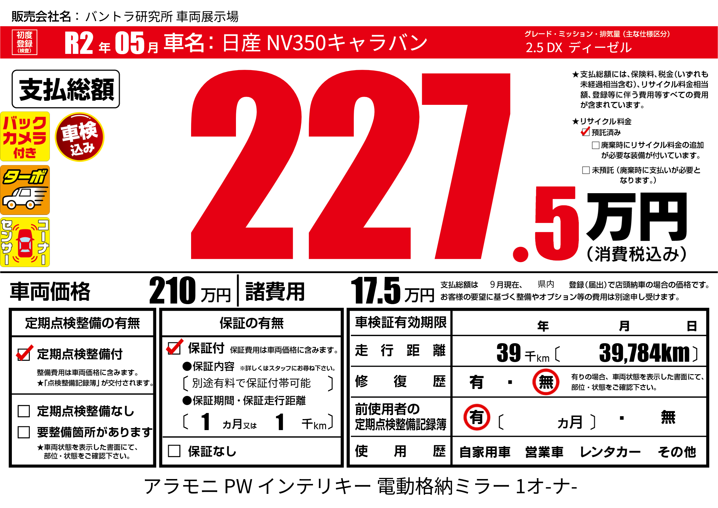 | 車検制限 | - 年 - 月 - 日 | ||