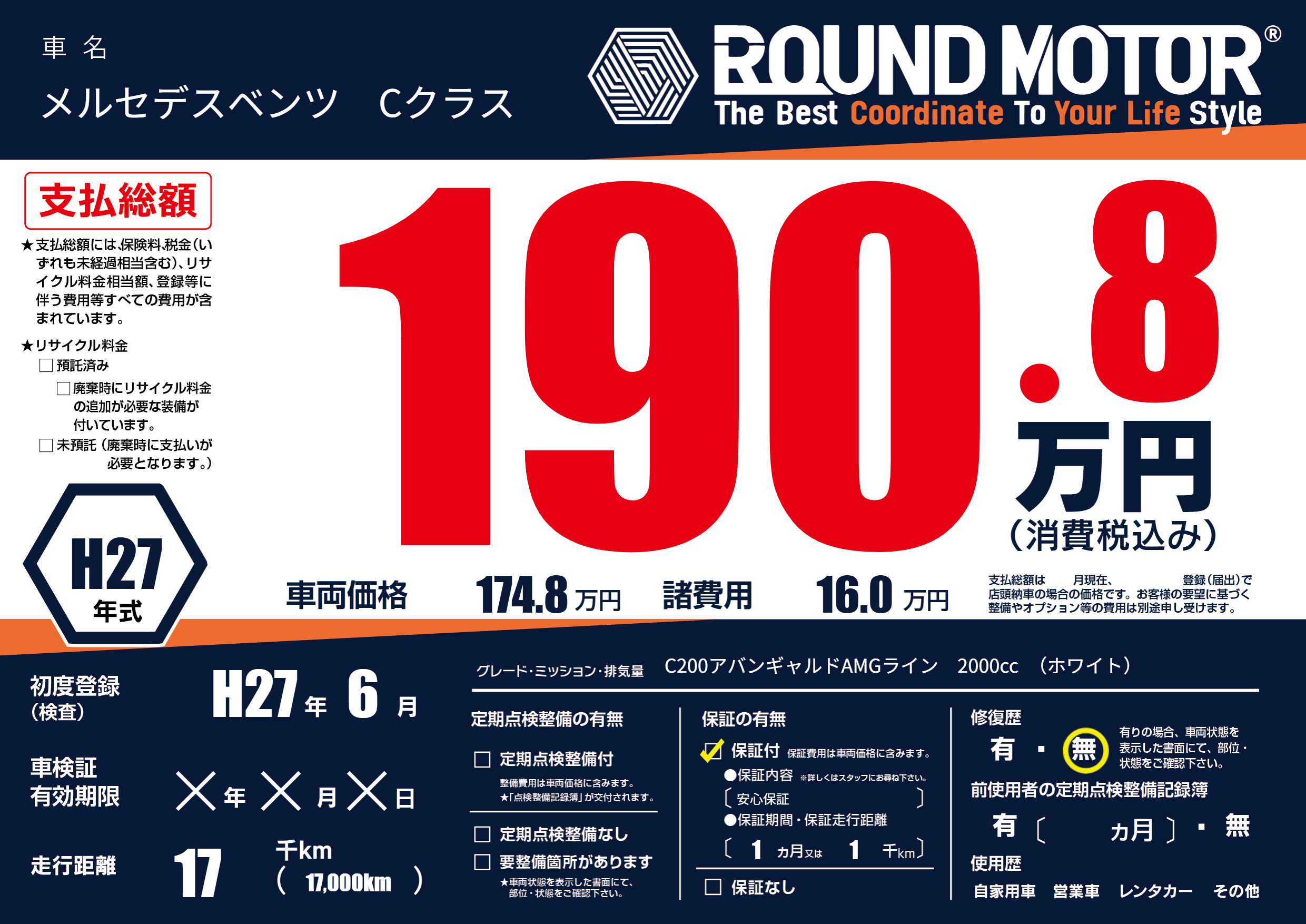 | 車名 | メルセデスベンツ Cクラス | グレード ミッション 排気量 |