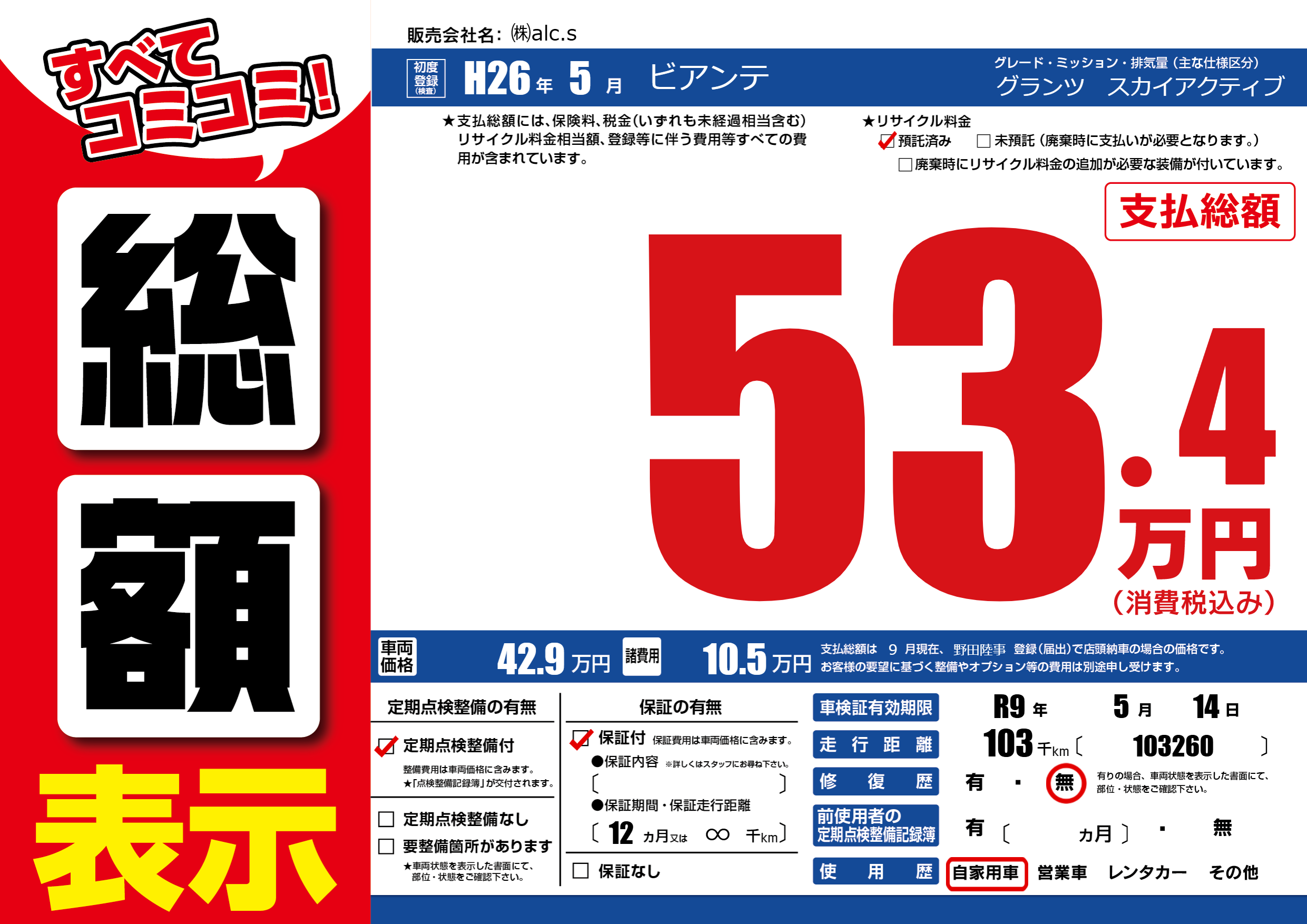 | 車名 | ビアンテ | グレード ミッション 排気量 |