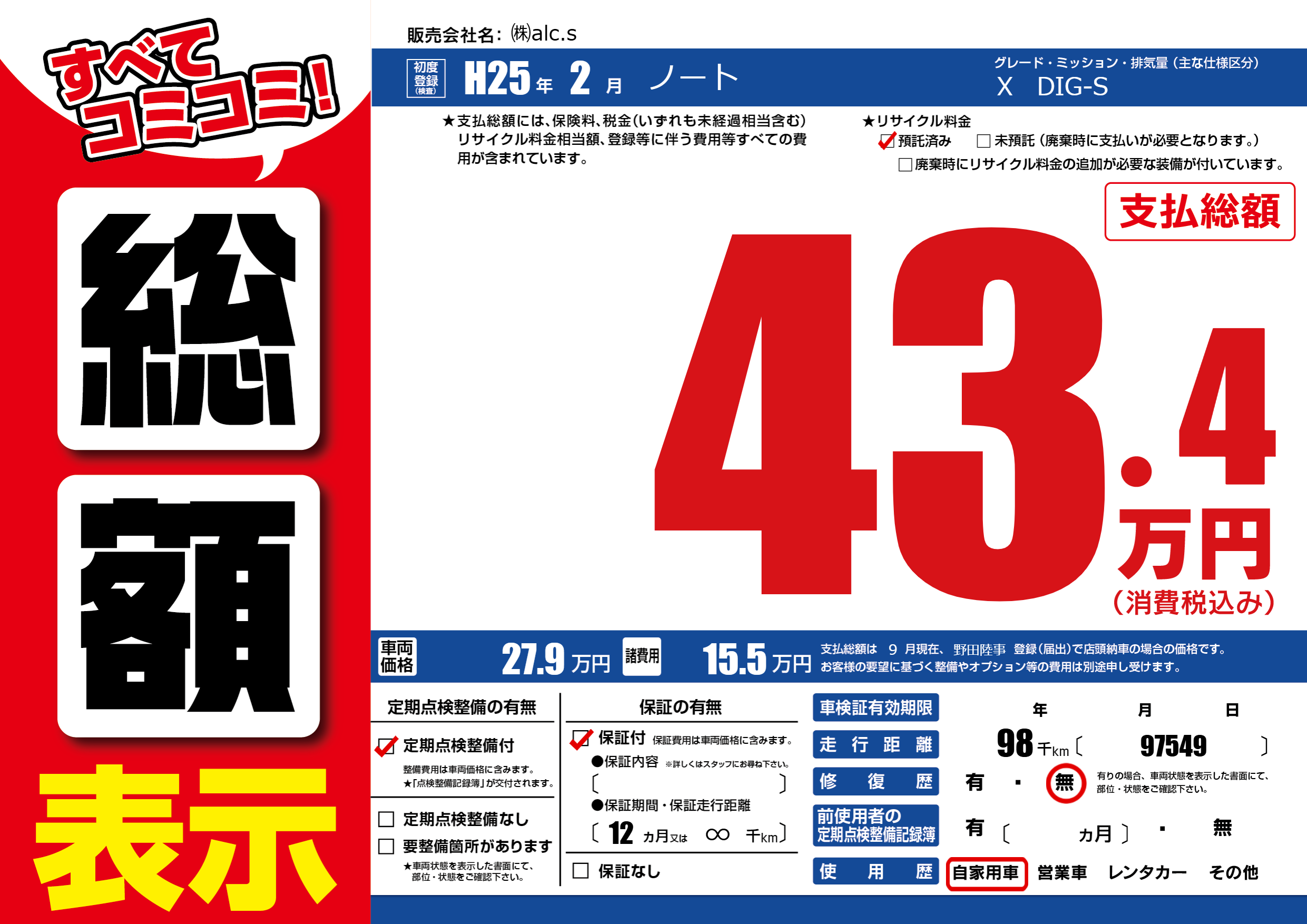 | 走行キロ | 9.8万km | 初年度登録 | H25年2月 |