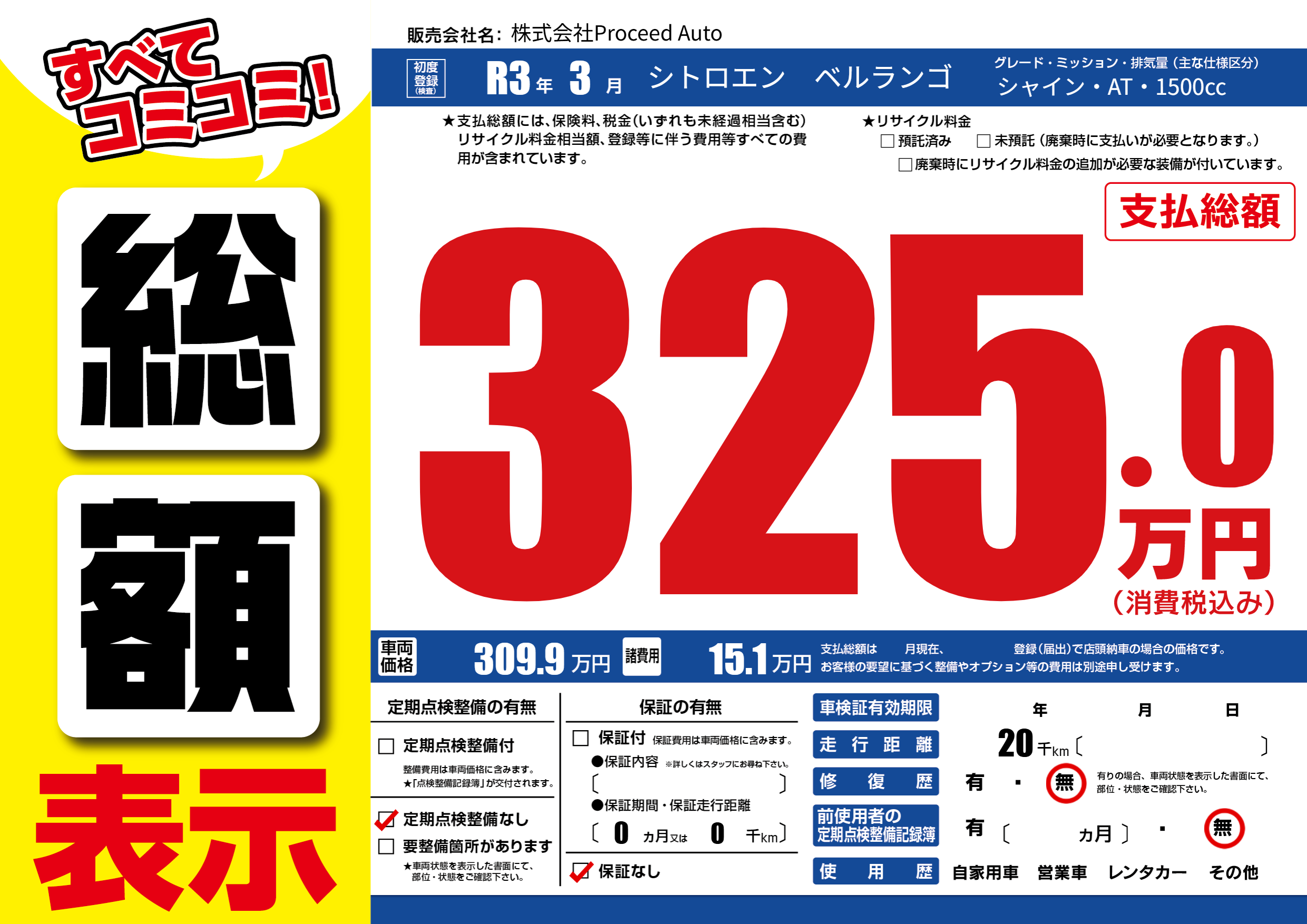 | 車名 | シトロエン ベルランゴ | グレード ミッション 排気量 |