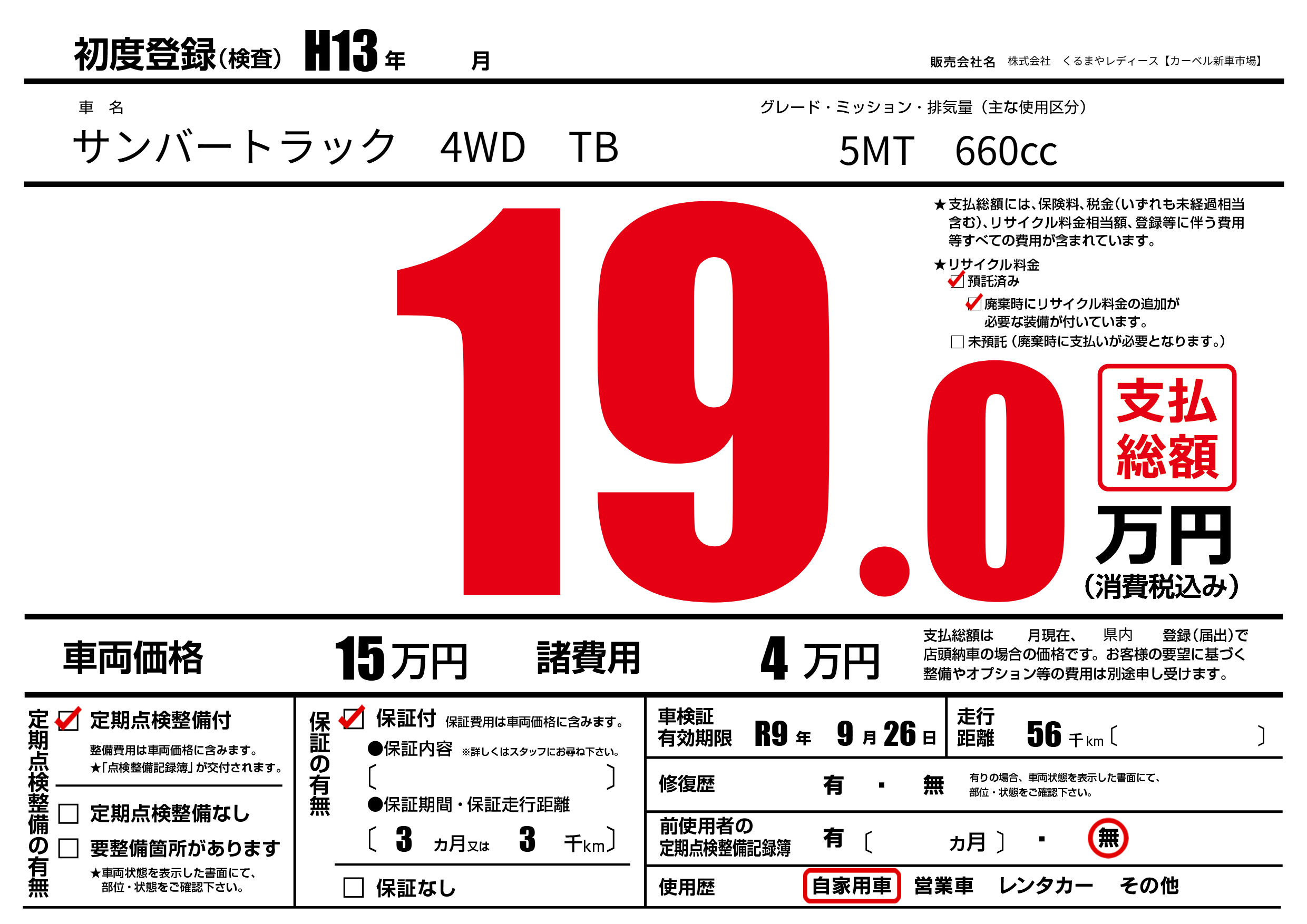 なし | 車検制限 | R9年9月26月 |