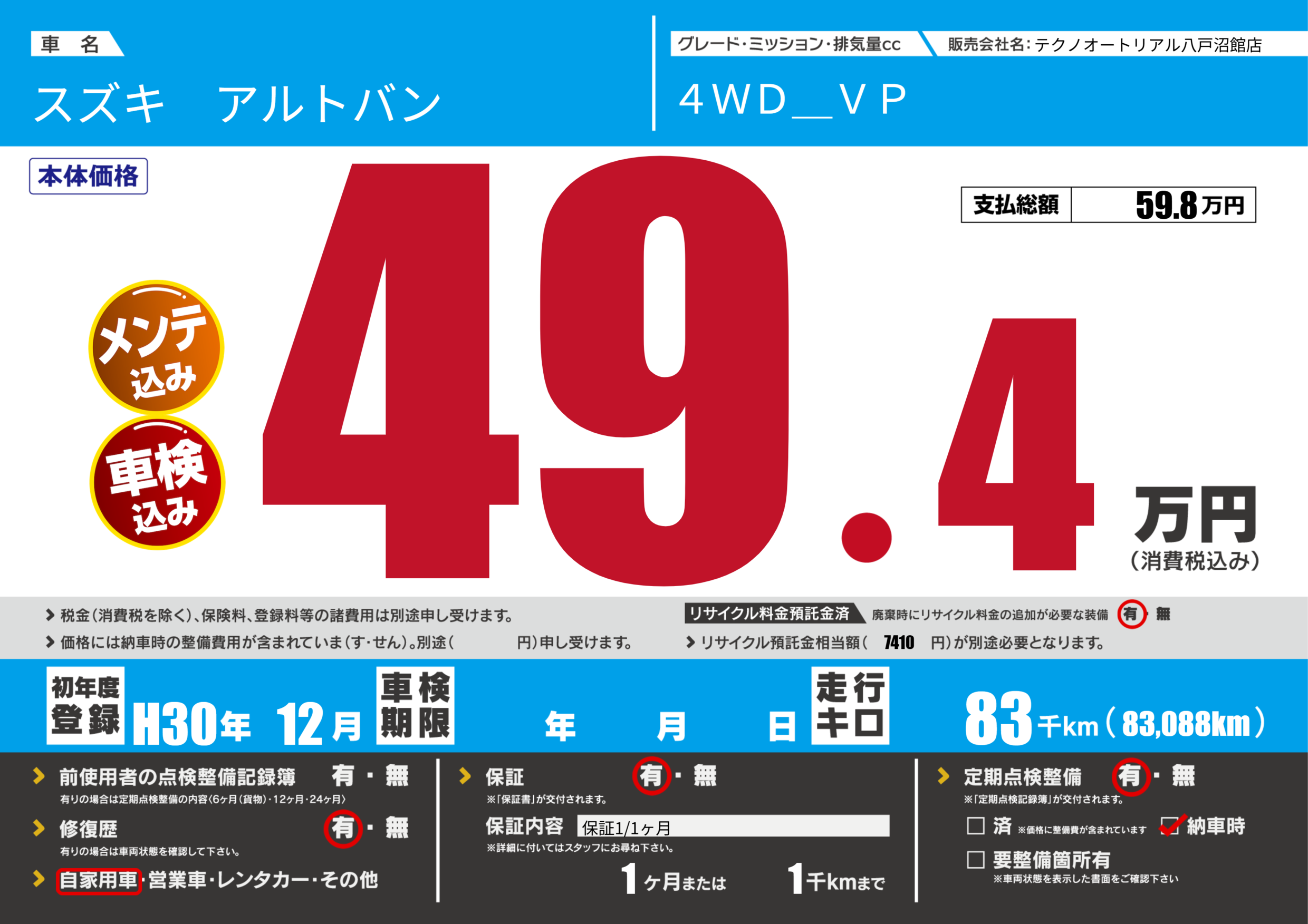 | 定期点検整備 | 定期点検整備あり 納車時あり | ||