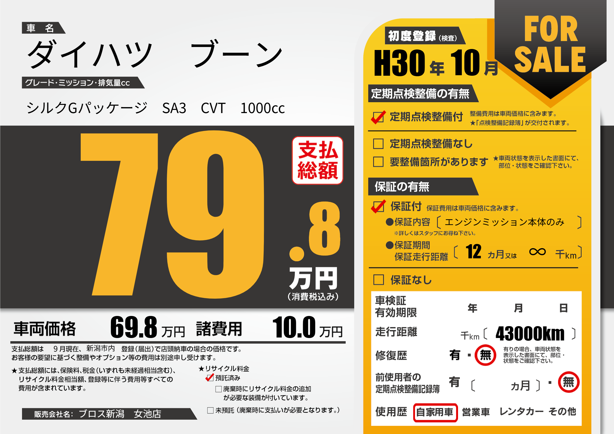 | 車名 | ダイハツ ブーン | グレード ミッション 排気量 |