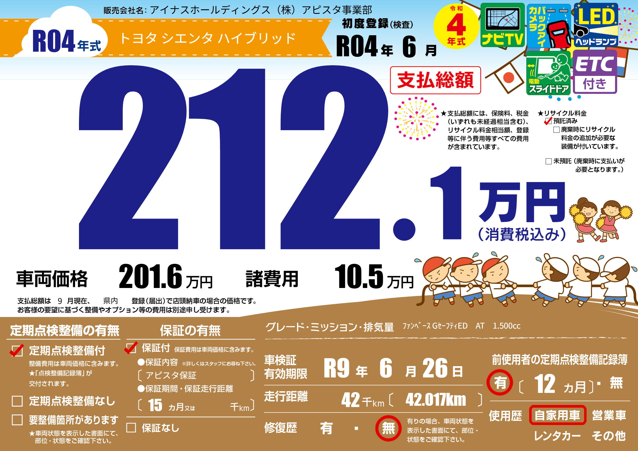 | 車名 | トヨタ シエンタ ハイブリッド | グレード ミッション 排気量 |