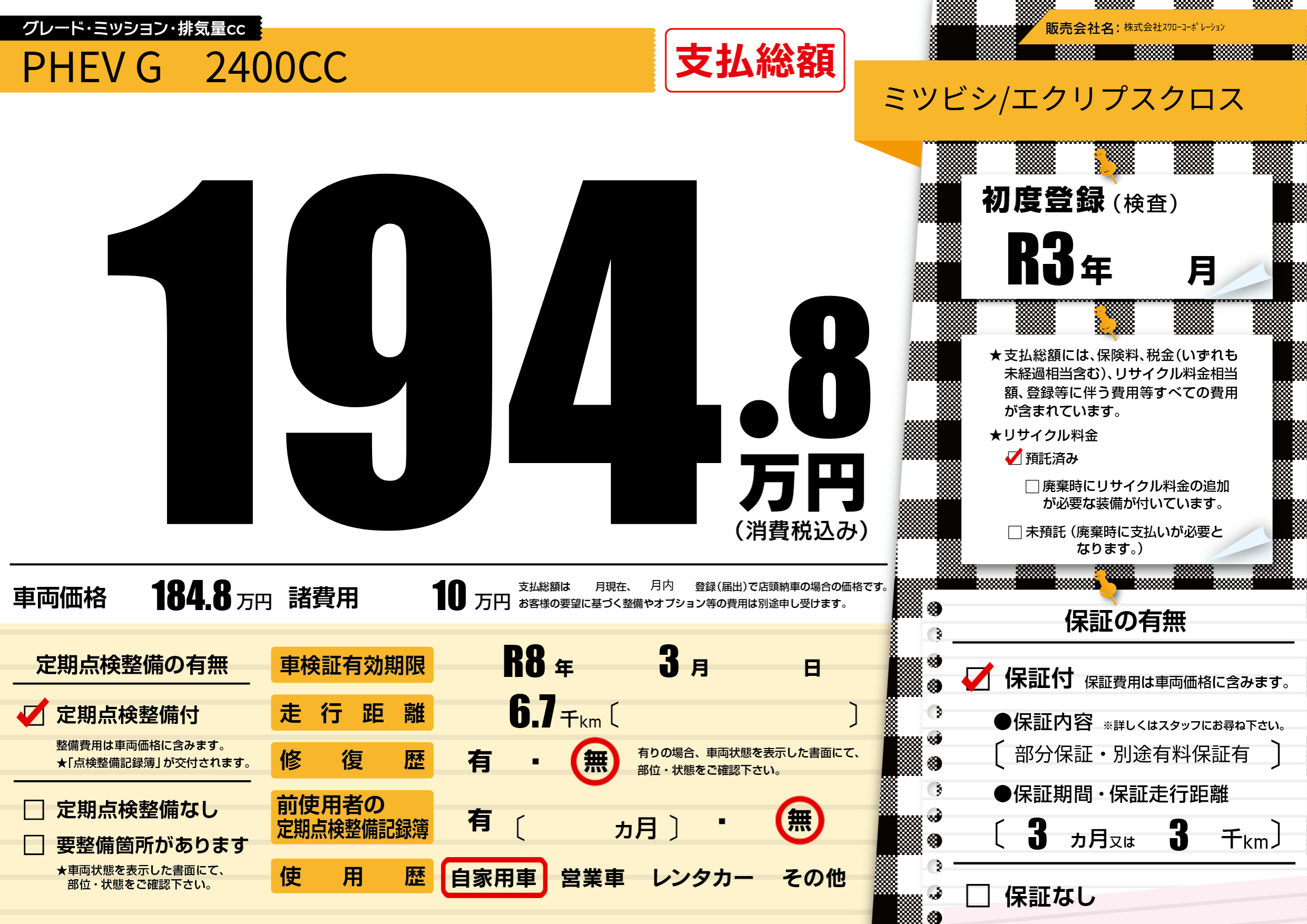 | 車名 | ミツビシ/エクリプスクロス | グレード ミッション 排気量 |