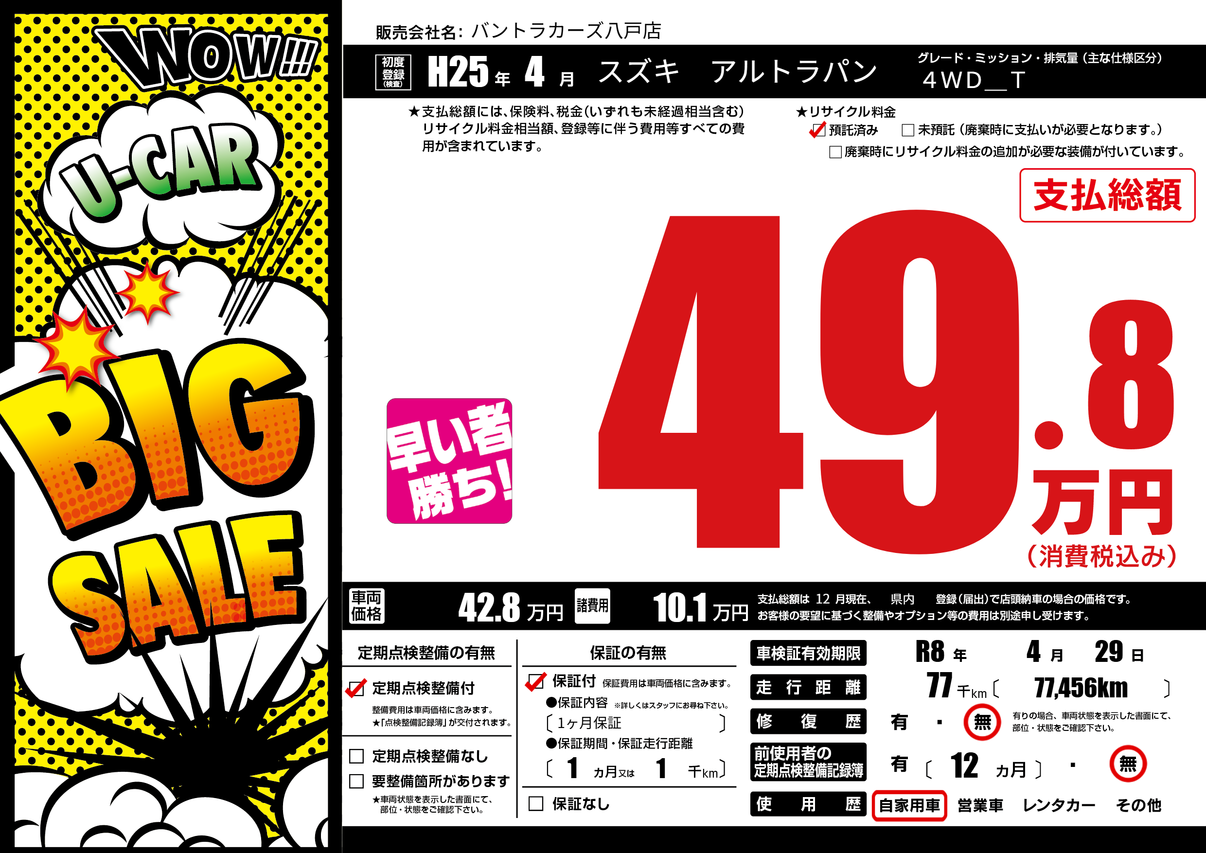 | 走行キロ | 7.7万km | 初年度登録 | H25年4月 |