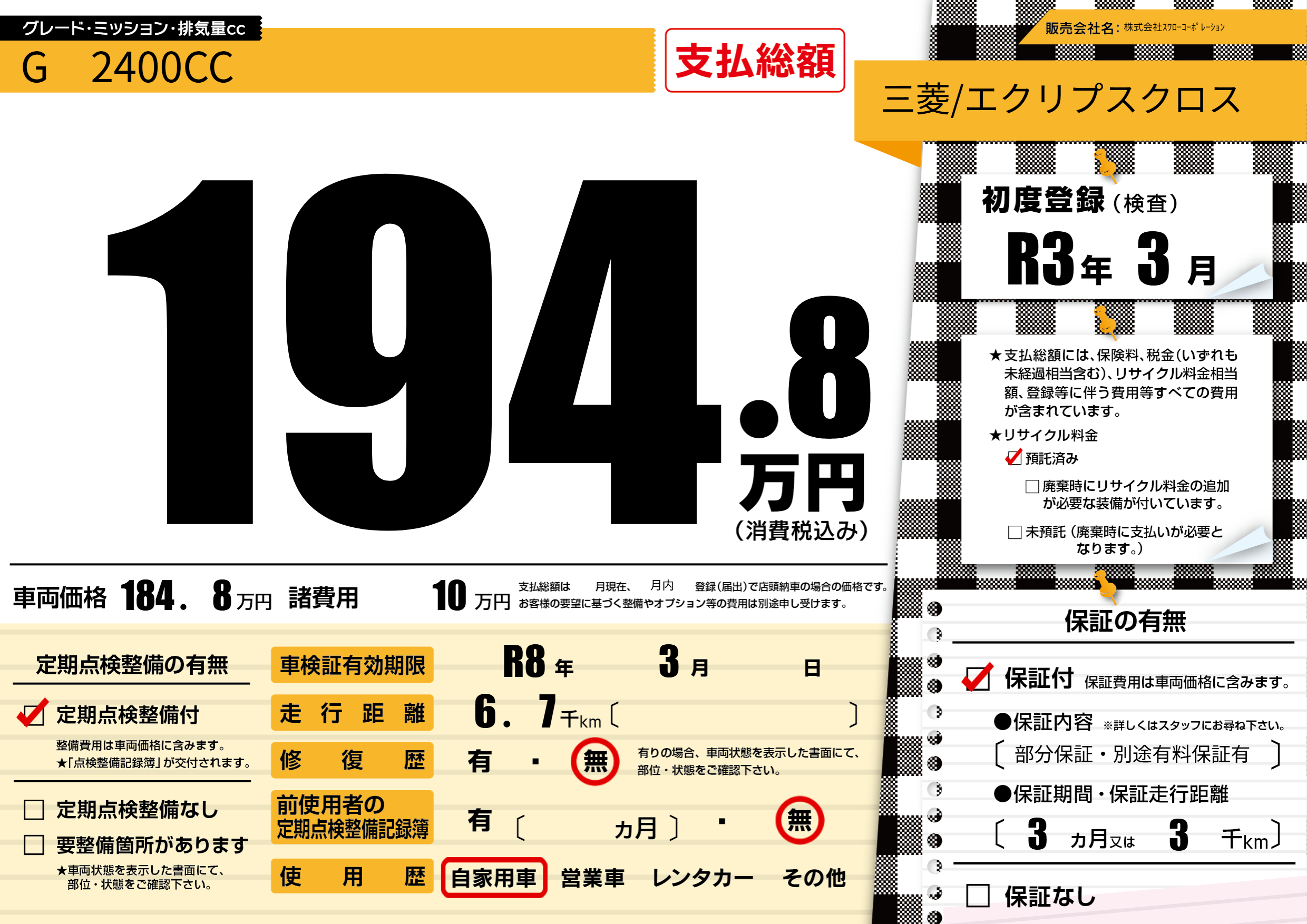 | 車名 | 三菱/エクリプスクロス | グレード ミッション 排気量 |