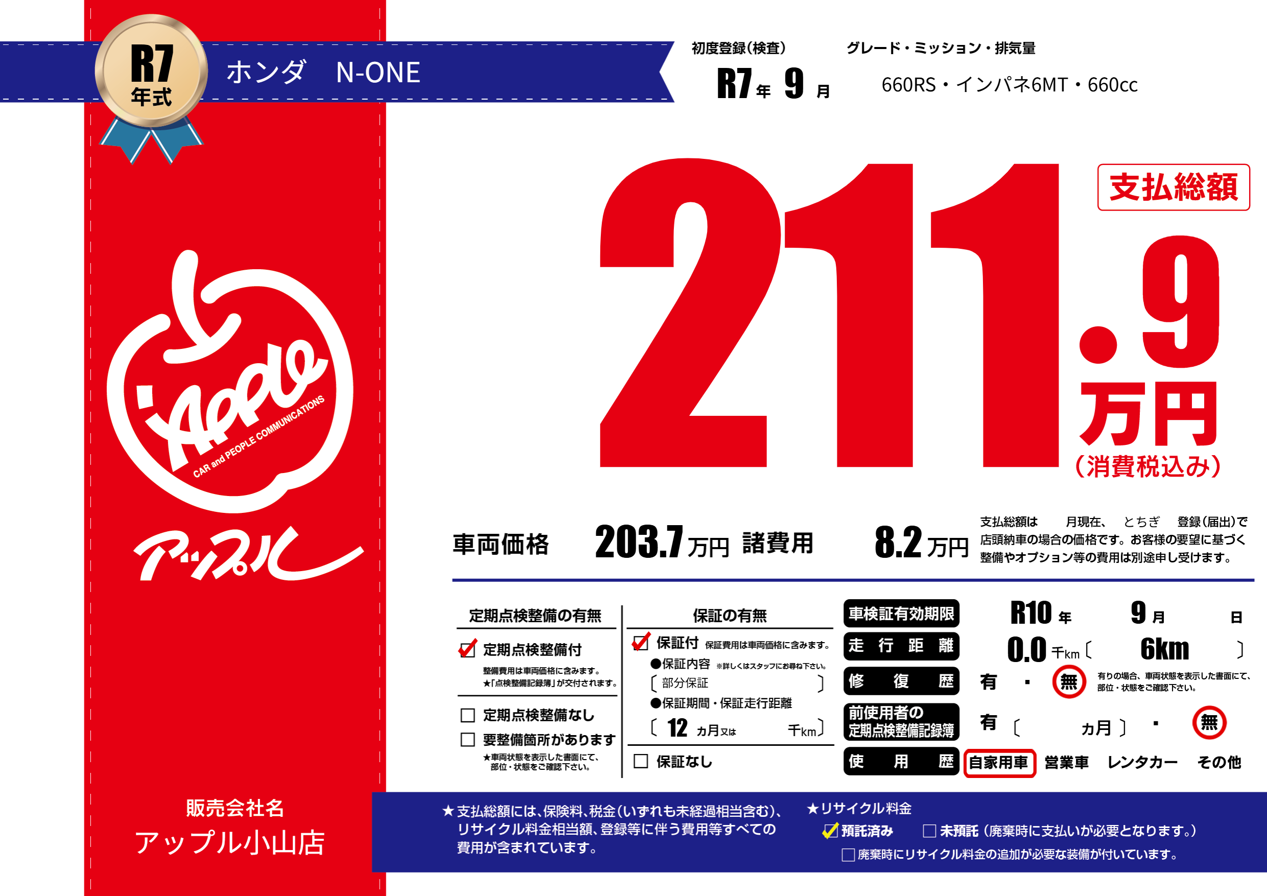 なし | 車検制限 | R10年9月---月 |