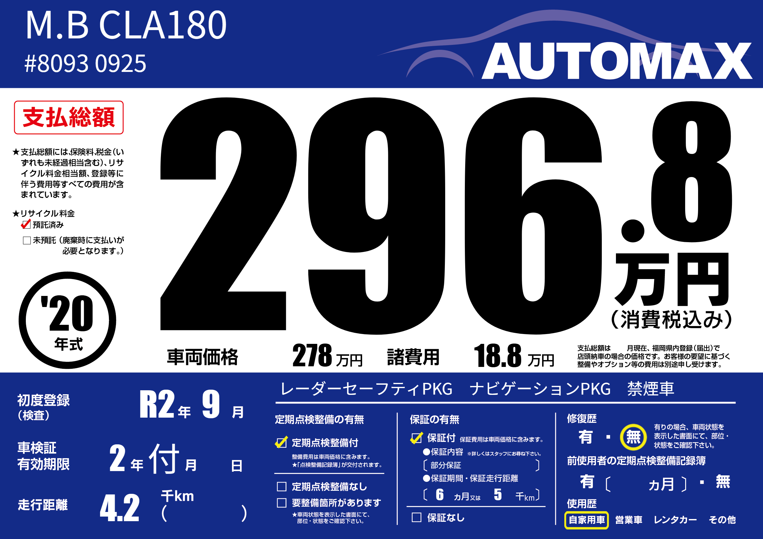 | 車名 | M.B CLA180 | グレード ミッション 排気量 |
