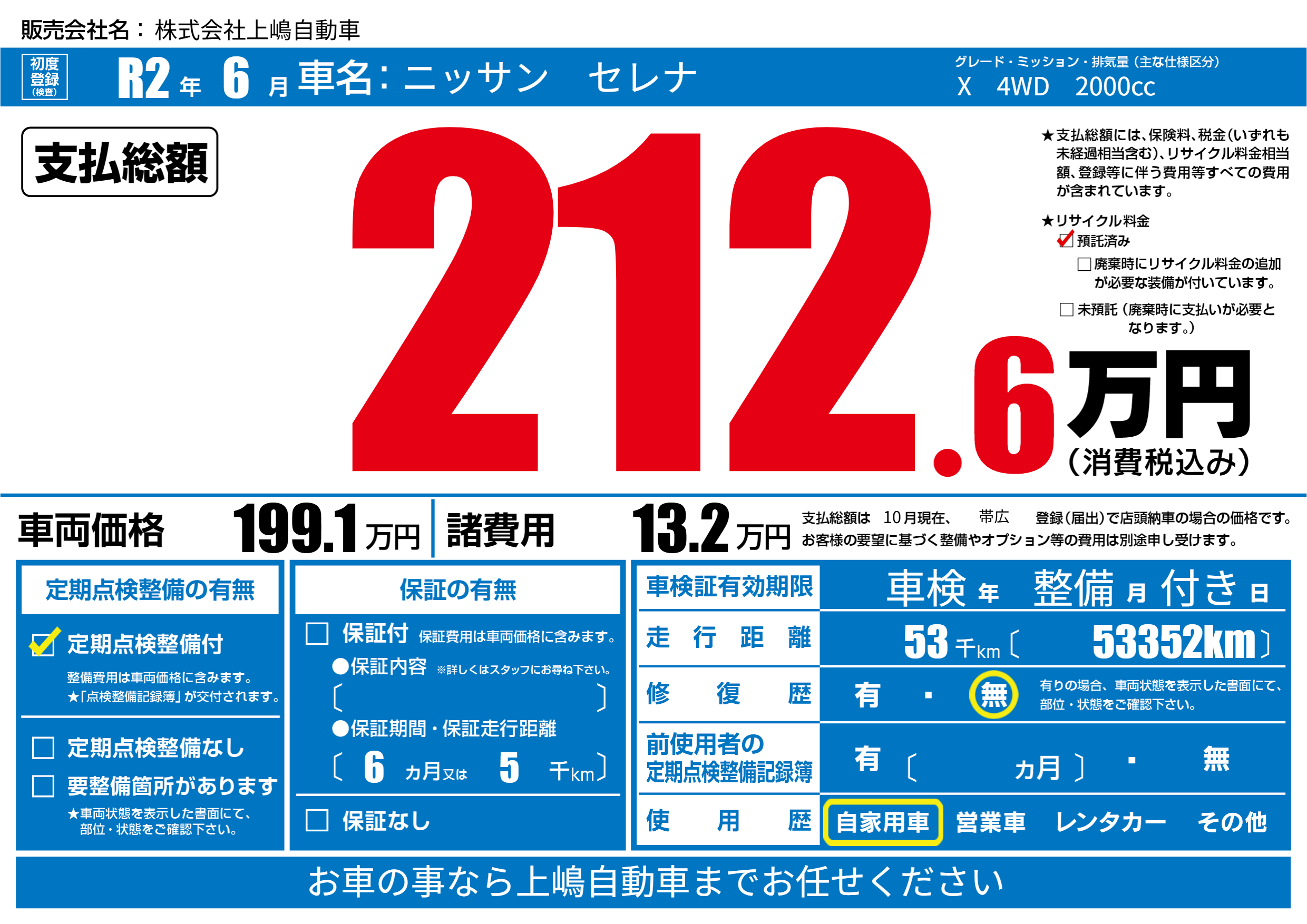| 車名 | ニッサン セレナ | グレード ミッション 排気量 |