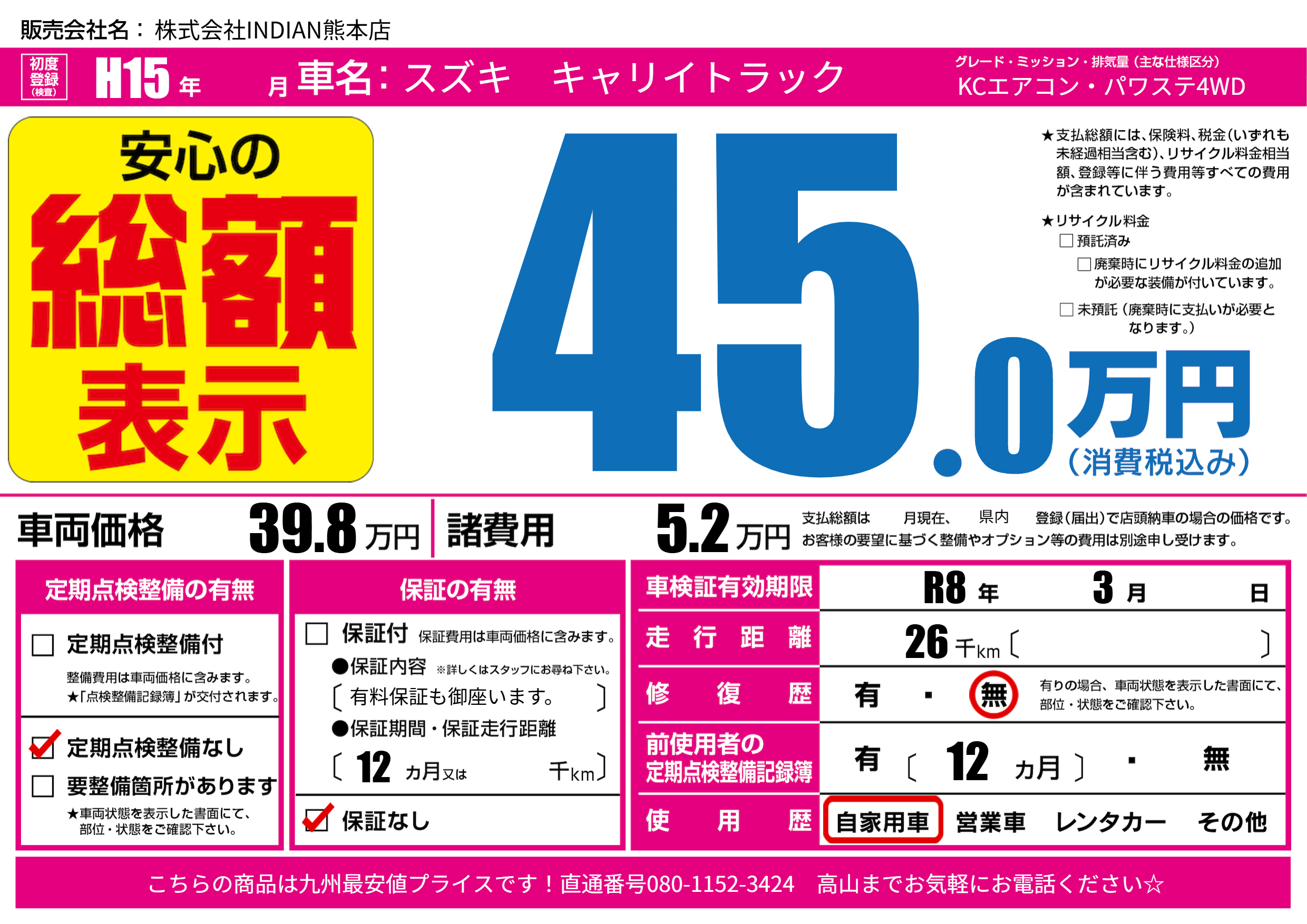 | 走行キロ | 2.6万km | 初年度登録 | H15年---月 |