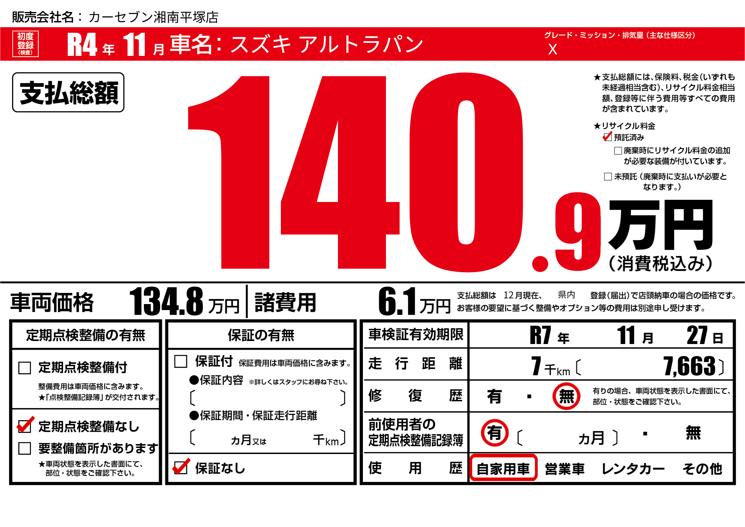 | 走行キロ | 0.7万km | 初年度登録 | R4年11月 |