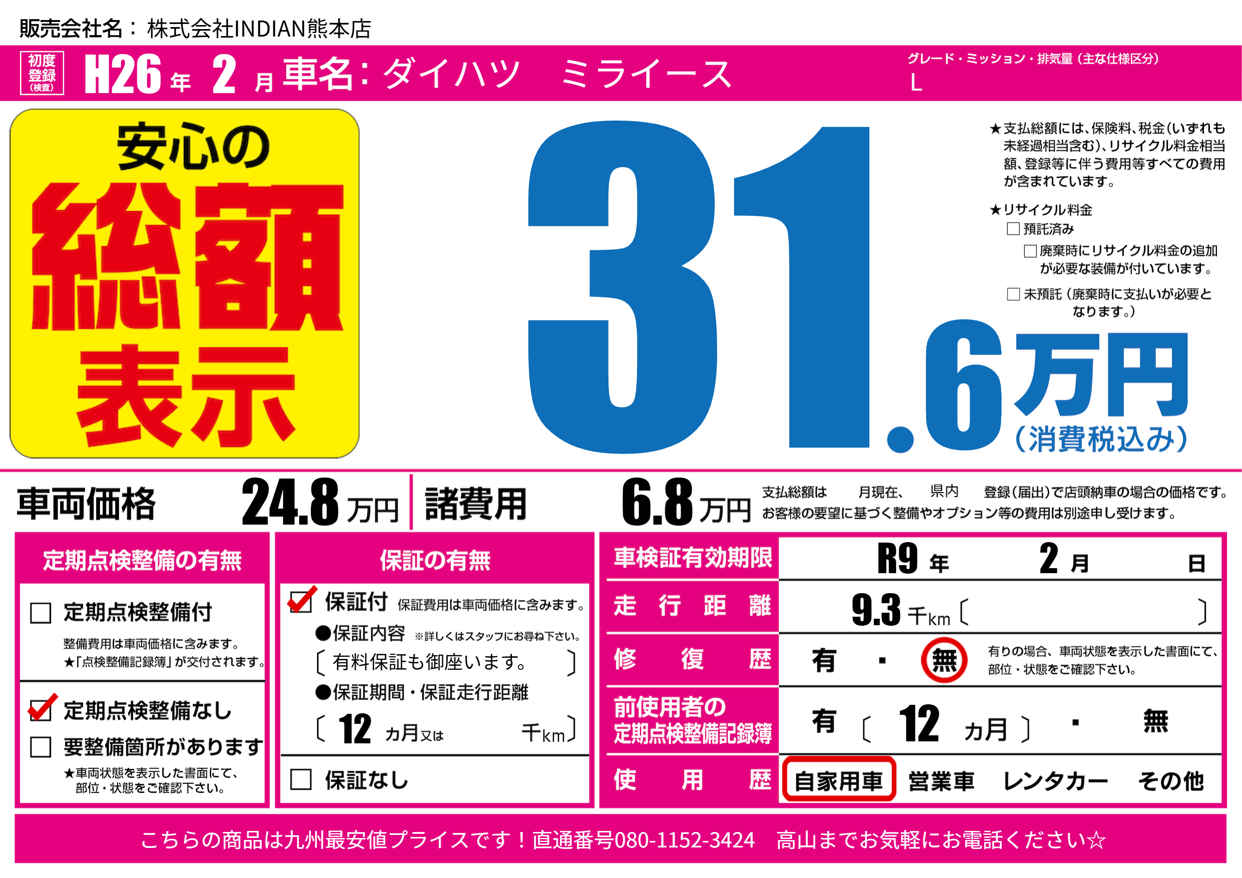 | 走行キロ | 0.9万km | 初年度登録 | H26年2月 |