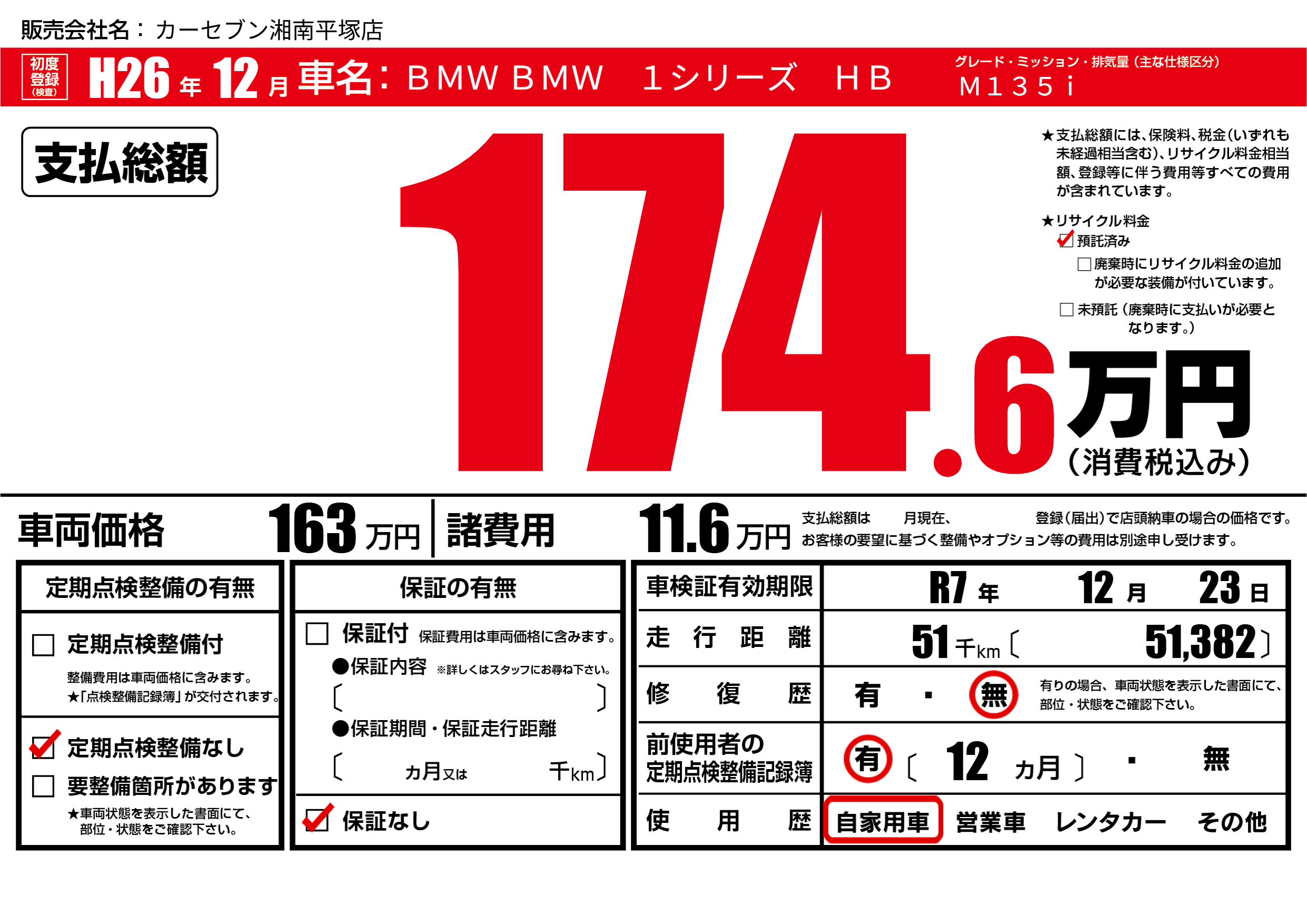 なし | 車検制限 | R7年12月23月 |