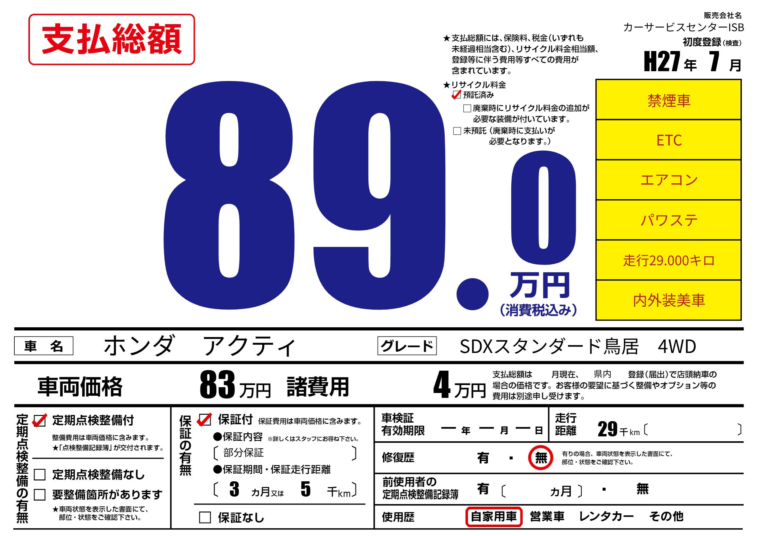 | 車名 | ホンダ アクティ | グレード ミッション 排気量 |