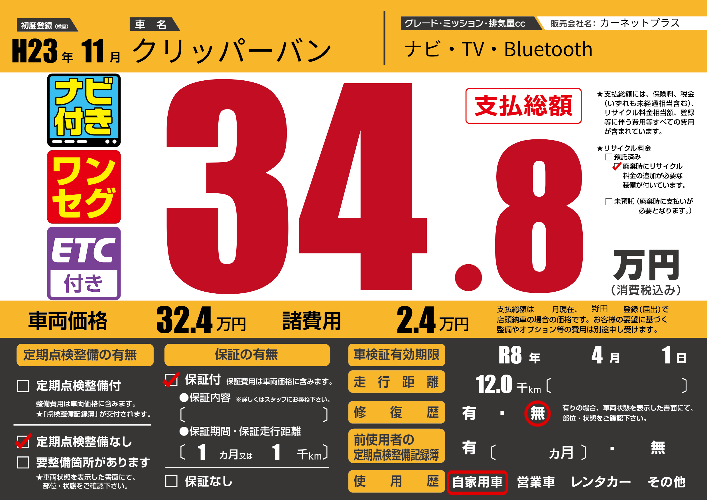 | 走行キロ | 1.2万km | 初年度登録 | H23年11月 |