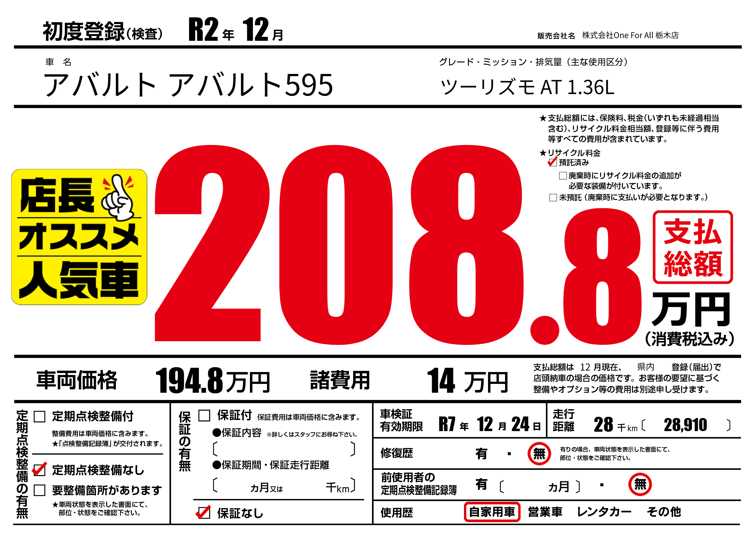 | 車名 | アバルト アバルト595 | グレード ミッション 排気量 |