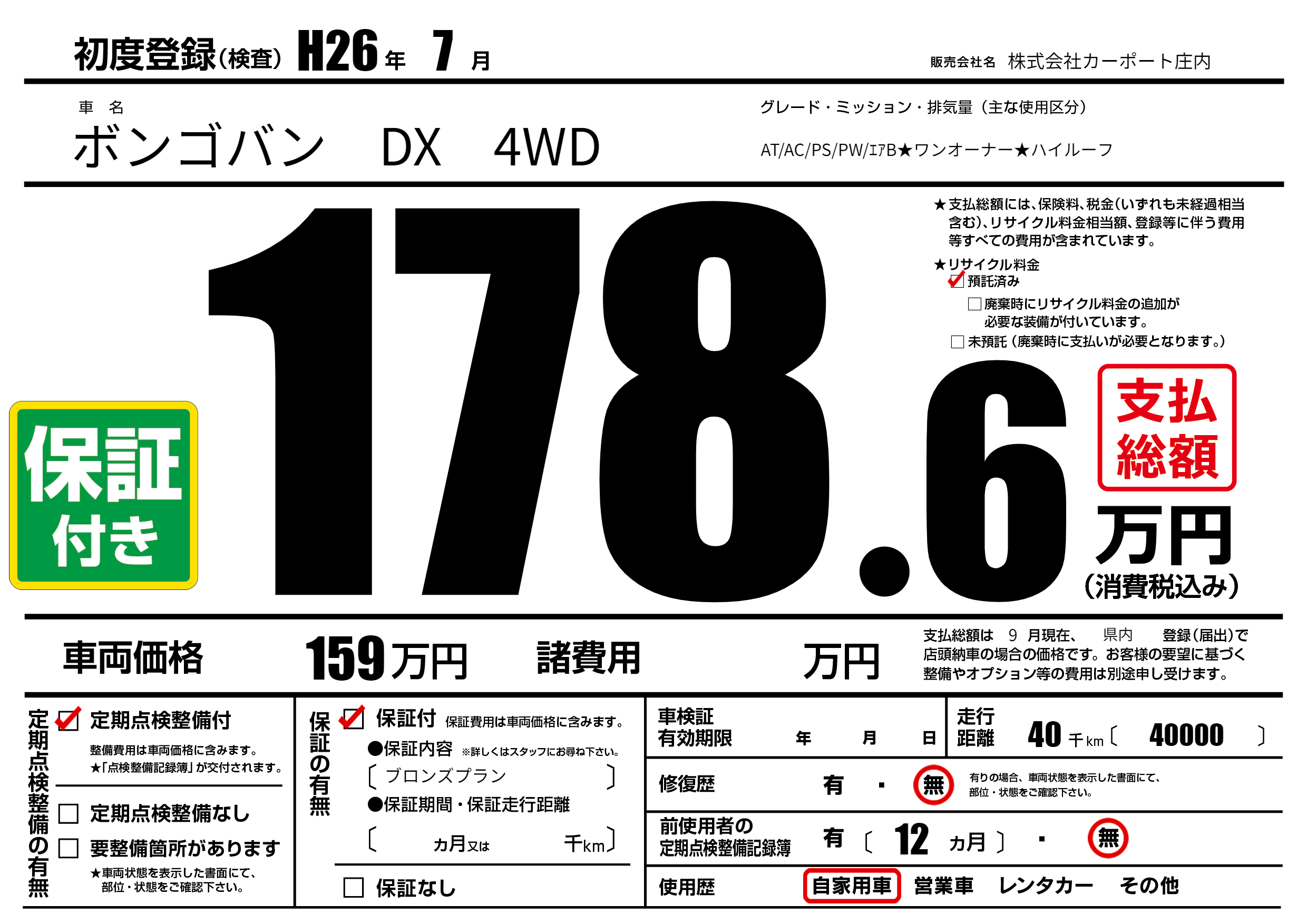 | 車名 | ボンゴバン DX 4WD | グレード ミッション 排気量 |