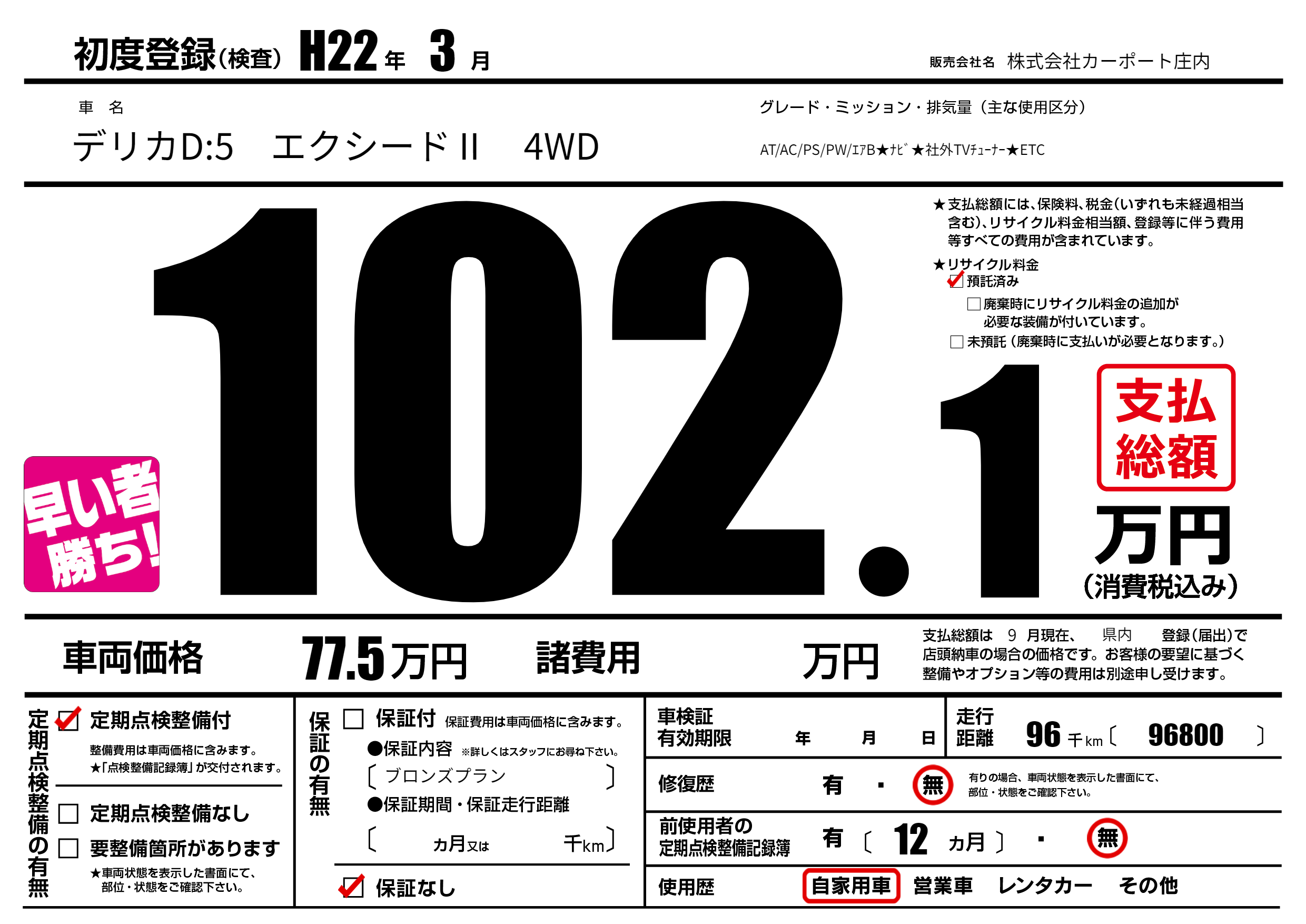 | 走行キロ | 9.6万km | 初年度登録 | H22年3月 |