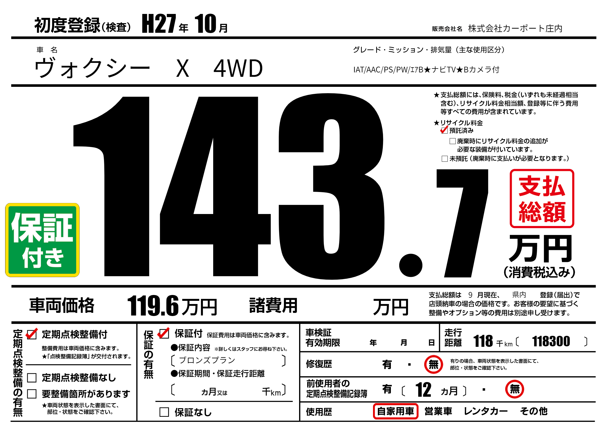 | 車名 | ヴォクシー X 4WD | グレード ミッション 排気量 |