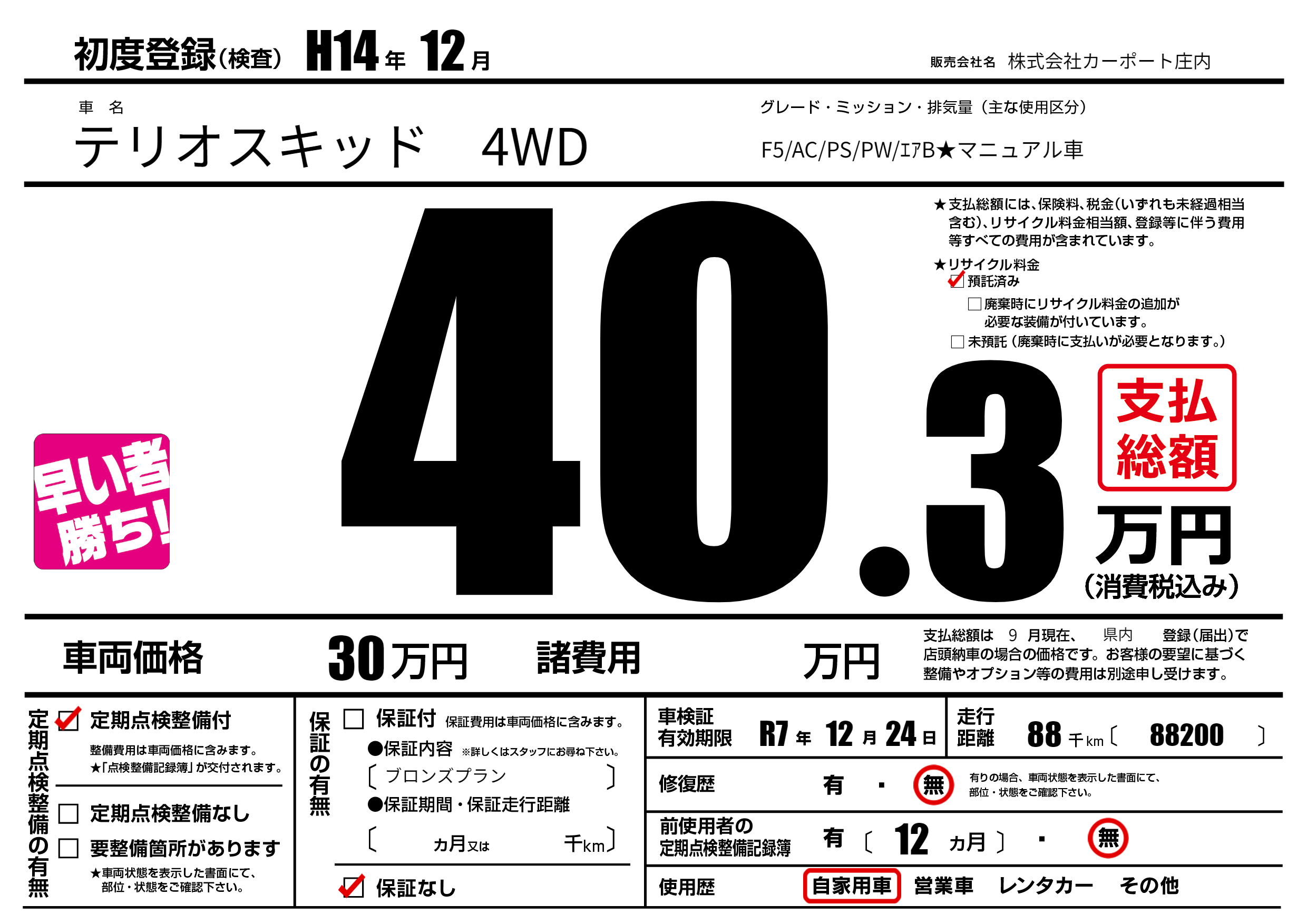 | 車名 | テリオスキッド 4WD | グレード ミッション 排気量 |