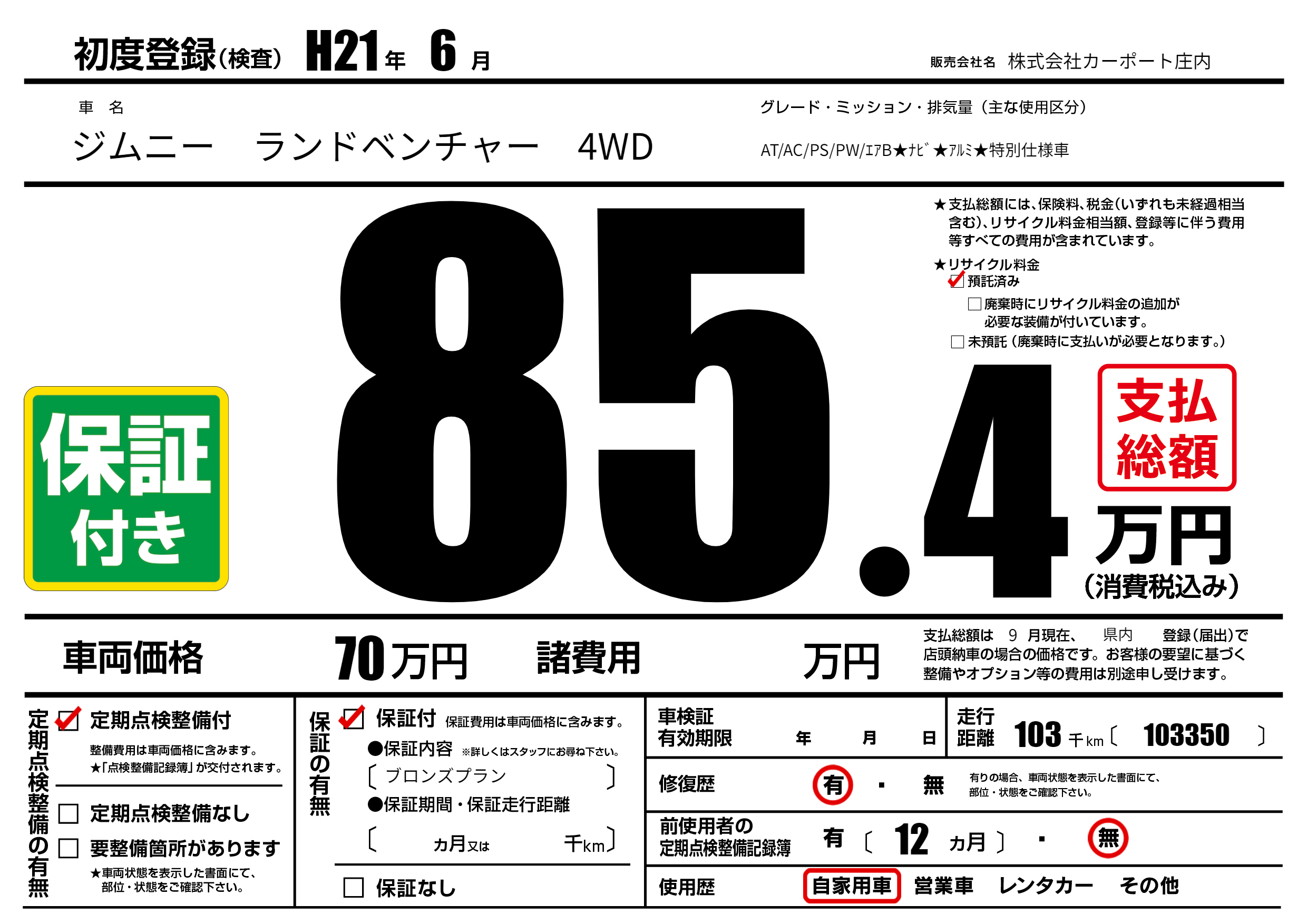 | 車名 | ジムニー ランドベンチャー 4WD | グレード ミッション 排気量 |
