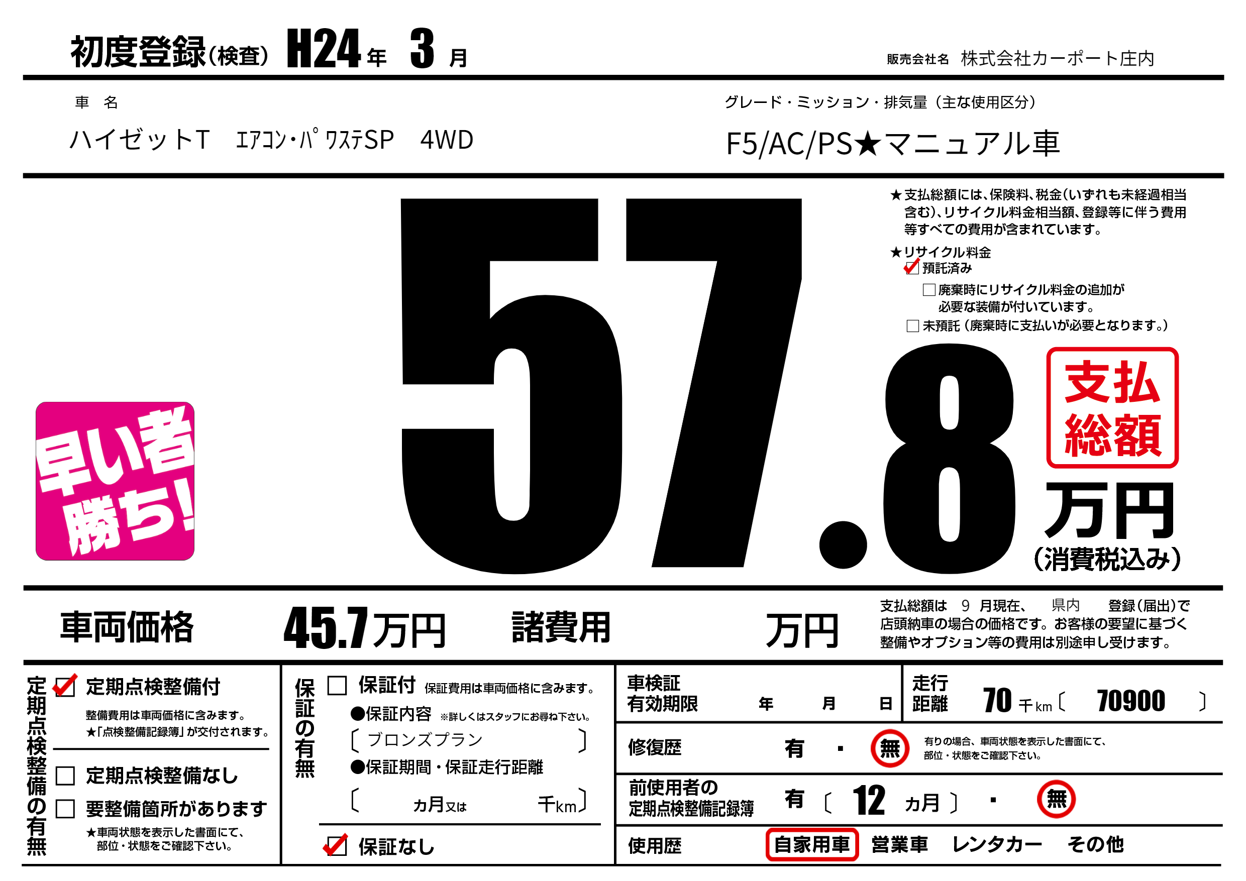 | 走行キロ | 7万km | 初年度登録 | H24年3月 |