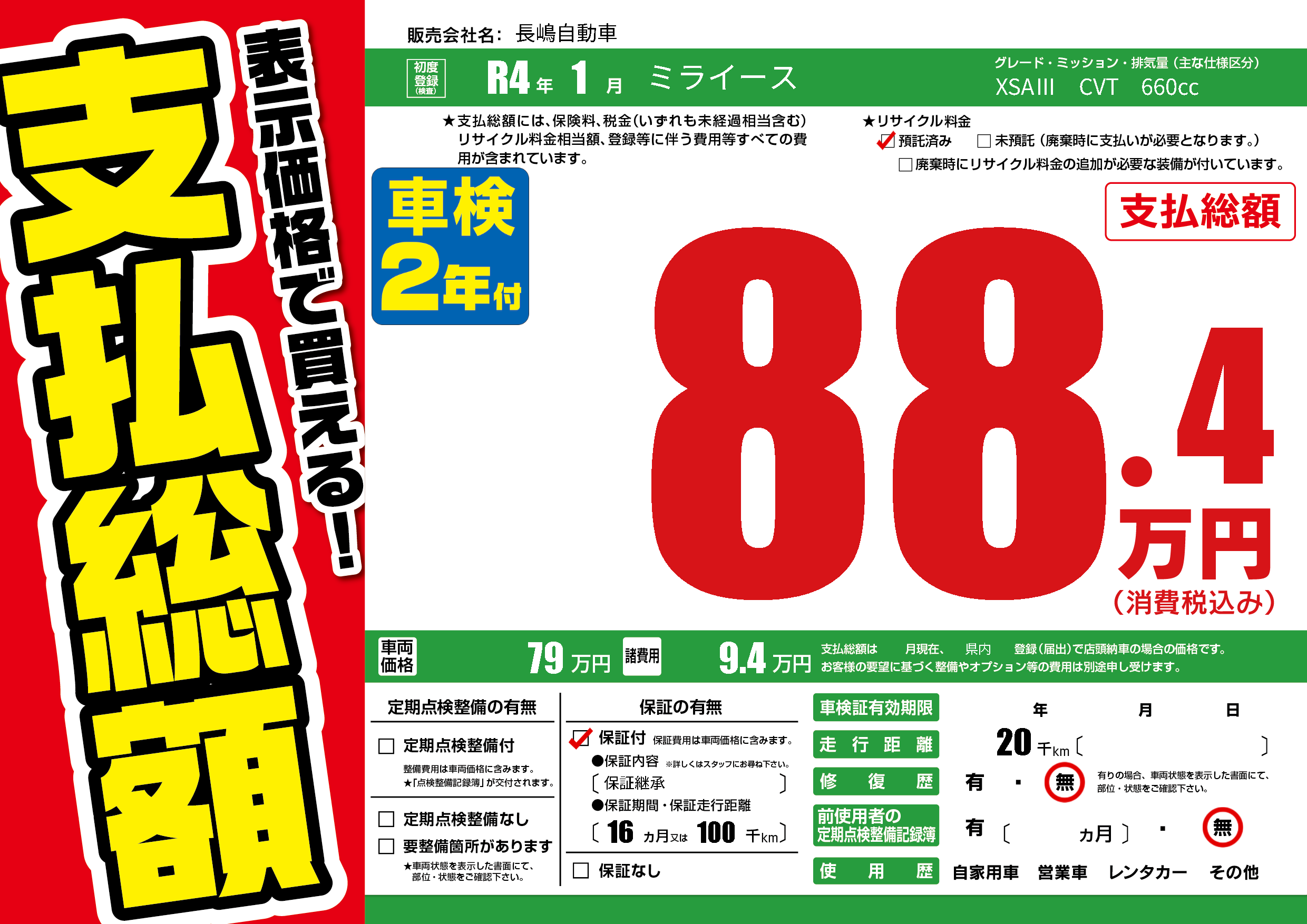 保証付き 保証内容(保証継承) 16ヶ月または(100)千kmまで |