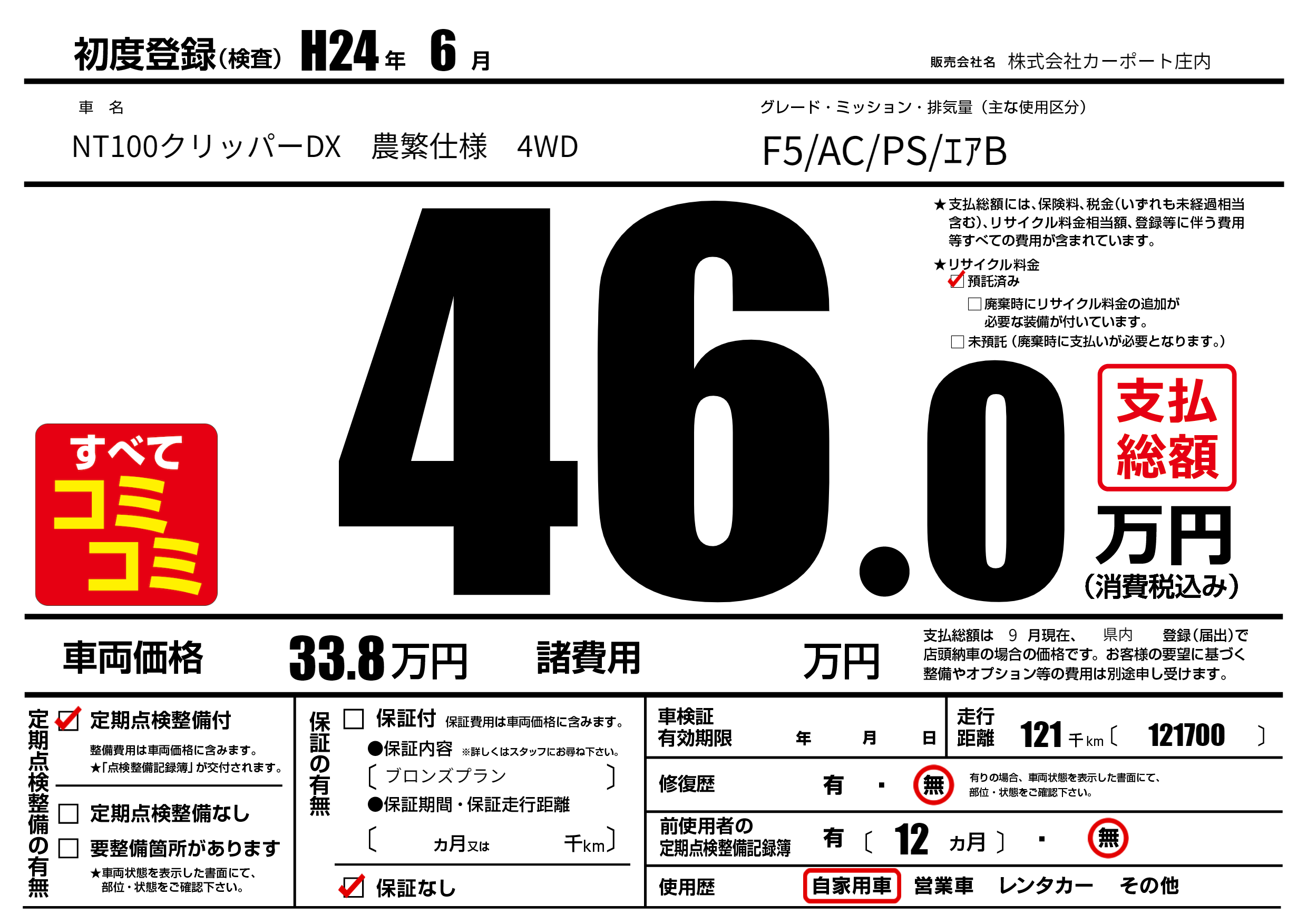 | 走行キロ | 12.1万km | 初年度登録 | H24年6月 |